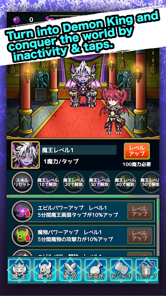 一个RPG型的闲置游戏,即使在短暂的休息时间,您也可以玩。 变成恶魔王并通过不活动和水晶来征服世界! ◆怪物 获得黑暗的魔法力量,提高怪物的等级。 进攻和征服受天使保护的国家。 ◆增强 功能在魔术实验室为怪物创建增强项目。 加强你的怪物大军! ◆技能 明智地使用您的恶魔技能来推进入侵。 ◆惩罚 您可以惩罚抓到的敌人! 模式的数量高于上一个。 ◆声音代理 所有角色以完整的声音代理播放。
