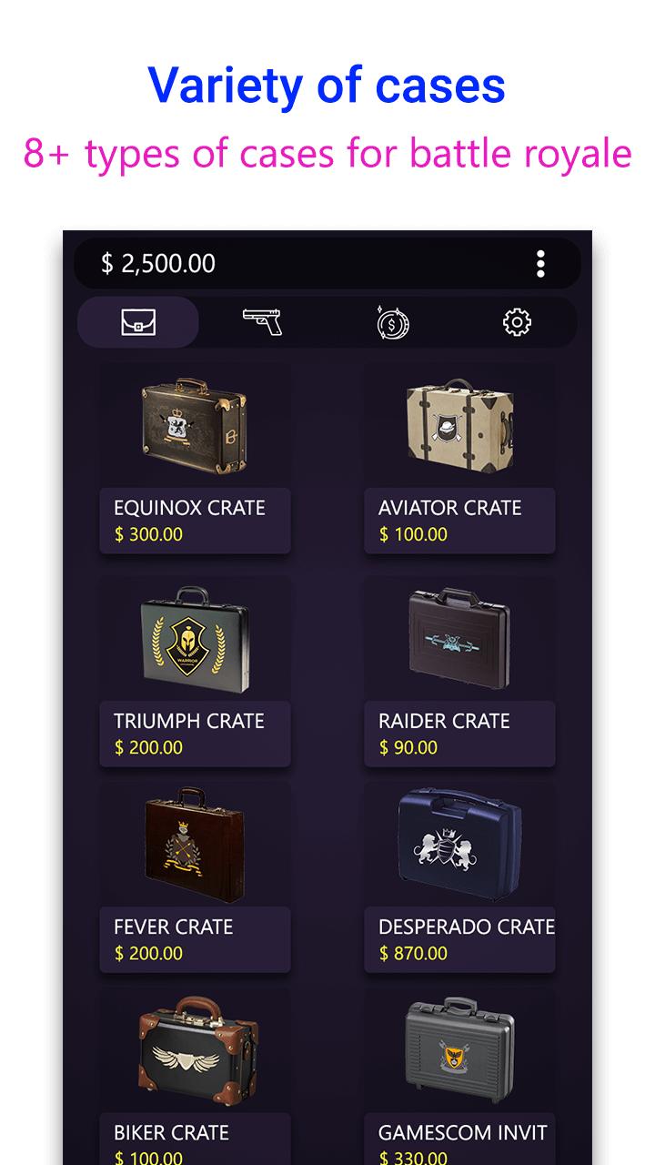 您必须已经在手机上玩过大逃杀游戏,并且使用不同皮肤玩游戏会带来很多变化。 通常,通过打开板条箱/盒子,我们可以在游戏中解锁新的皮肤,但是碰巧我们没有得到我们喜欢的皮肤。 该游戏是大逃杀游戏的案例模拟器,您将在其中获得各种皮肤的各种案例。在这里,您可以解锁自己喜欢但未进入游戏的皮肤。 在此案例模拟器中,有8种类型的案例和150种大逃杀游戏项目。