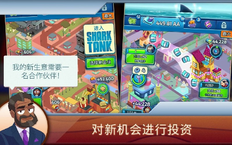 你具备在《Shark Tank》中生存的能力吗?在官方的挂机点击手机游戏《Shark Tank大亨》中建立你的商业帝国,成为亿万富翁。 作为坦克中最新的鲨鱼——听取创业者的点子,选择投资哪些公司和产品,发展你的帝国,成为自食其力的百万富豪甚至亿万富豪商业大亨!点击,点按,在排行榜上占据你的一席之地,证明你是顶级鲨鱼。在全球多个城市搜索有前途的企业家和发明家所创造的最佳企业和产品。你的帝国发展得越多,你就能赚取更多的闲置现金,即使在离线状态也不例外! 坦克中的下一个鲨鱼就是你!你是加入还是出局? 终极《Shark Tank》移动游戏现在登陆你的手机和平板电脑!成为下一个鲨鱼,打败竞争对手,征服商业世界。 《Shark Tank大亨》提供令人兴奋和令人上瘾的挂机点击游戏机制,包括: 每日任务:每天完成有趣且具有挑战性的任务,赚取更多金钱,获得竞争优势。 投资产品:选择你想要打造、营销和发展的产品。作为一个鲨鱼,你决定如何投资,进行高风险交易,消灭竞争。 建立企业:解锁、管理、升级企业,赚取更多闲置资金。点击和点按,更快地成为亿万富豪!