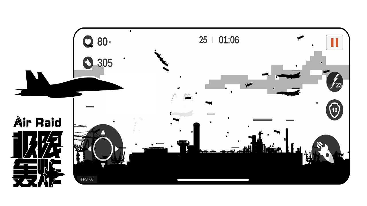 1. 游戏类型:2D横向卷轴STG(飞行射击类)游戏 2. 游戏设计风格:黑白剪影、像素 3. 游戏简介:不断升级的任务难度,让收复行动变得越来越不可能,只有做出各种极限操作,才能顺利通关。为方便各位飞行员更好的执行任务,在每个有难度的关卡开始时,都设有增加**和防御的补给按钮,当然你也可以完全不加补给,试试能否顺利过关! 4. 玩法指导:玩家(飞行员)操控一架轰炸飞机,飞机可自动发射机枪子弹,消灭正前方的空中目标,同时可以点击投弹按钮轰炸敌方地面作战单位及建筑物。执行任务中操作飞机上下或者左右来闪避敌方的正前方子弹以及来自地面单位的炮弹和导弹(注意炮弹和导弹可造成较高伤害),从而顺利到达关底。摧毁敌方作战单位及建筑物可获得分数,摧毁数量越多,同时飞机生命值损失越小,获得的总分数越高。在执行任务过程中,可获得**、生命、护盾、闪电的补给。随着任务的难度越大,获得的补给种类就越多。当玩家战机生命值为0时,执行任务失败,需重新过关后才可进入下一任务关卡。 加油吧,飞行员们~