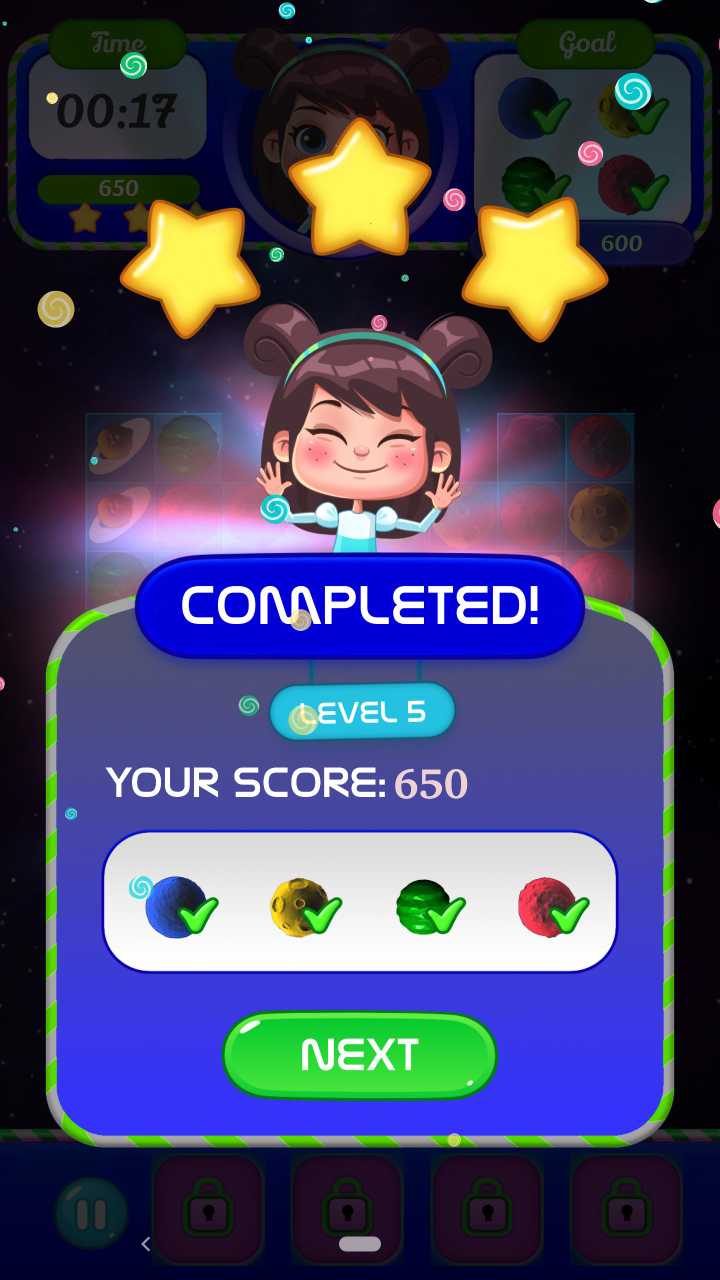 当行星碰撞时,起飞进入太空并在银河系中航行,您在恒星中越走越深。这是一款全新的三消游戏,您可以在其中穿梭于群星之间。 为了庆祝这个版本,我们正在做一个三重奖励周末。观看任何奖励广告并在本周末收到 300 枚而不是 100 枚金币。
