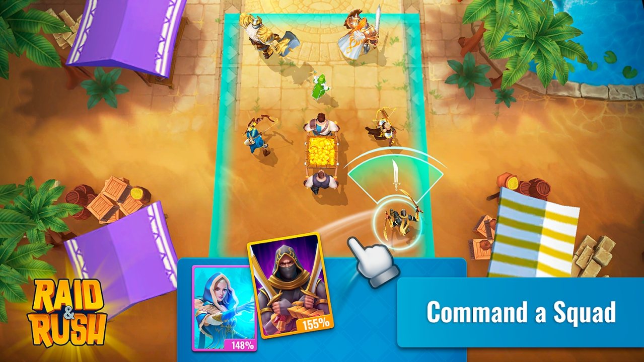 在冒险游戏“突袭先锋 RAID and RUSH”中收集您的战士队伍,与敌人战斗并保护您的金子!