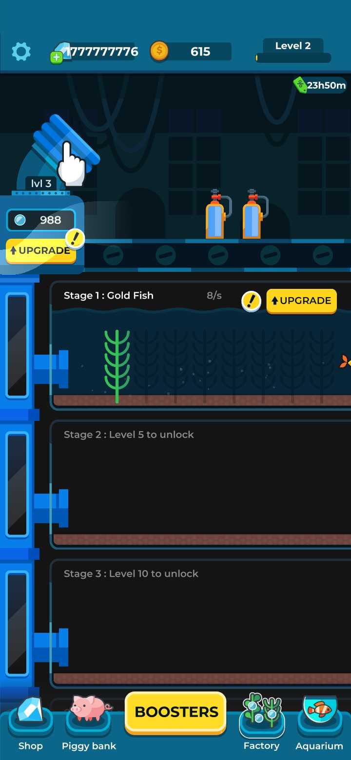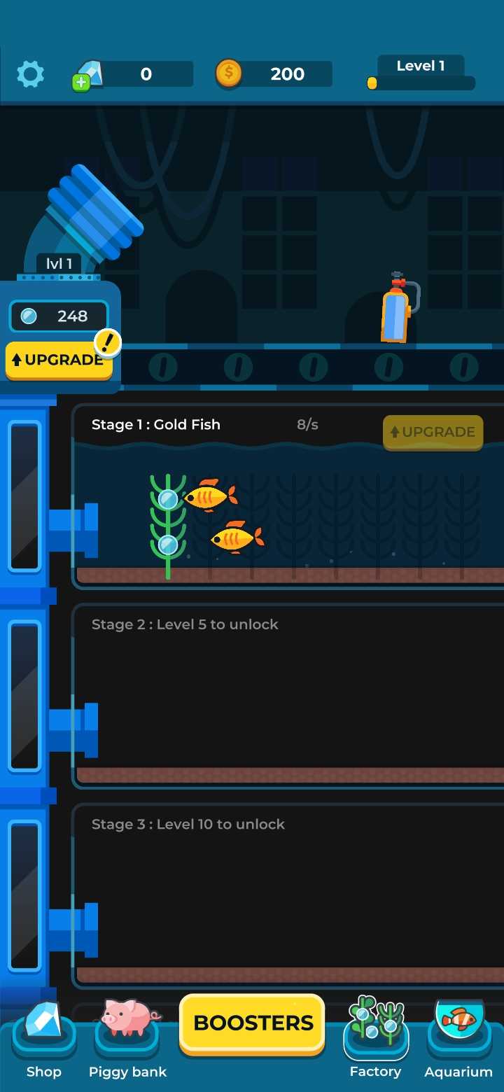 建立一个水族馆帝国!在你那小小的可移动的海洋里,有许多可爱的鱼。解锁带有独特鱼类类型的新鱼缸。建立丰富多彩的和有趣的水族馆,将推动您的业务到下一个水平。 藻类产生氧气,鱼类收集氧气气泡并把它们运输到氧气罐。这就是你如何赚取和投资更好的装备,新的鱼和藻类,以加快进程,并赚取更多的硬币!