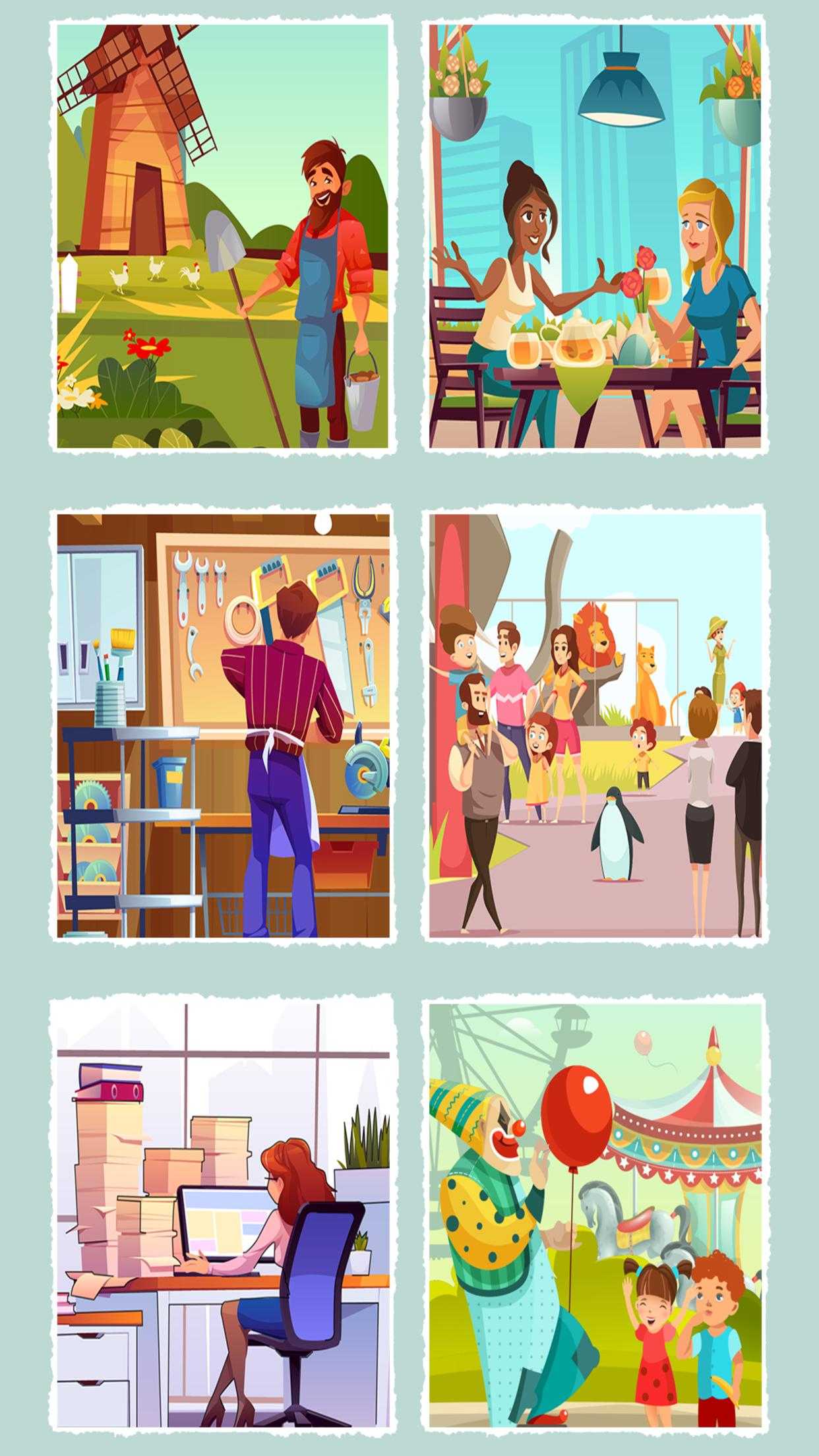 开始组装图片 - 最初上面不会有任何物体。要放置的项目将显示在底部。仔细查看图片,找到放置物品的位置。将所有物品放置到位后,图片就完成了!组合各种图片——牧场、城市公园、机场等等!