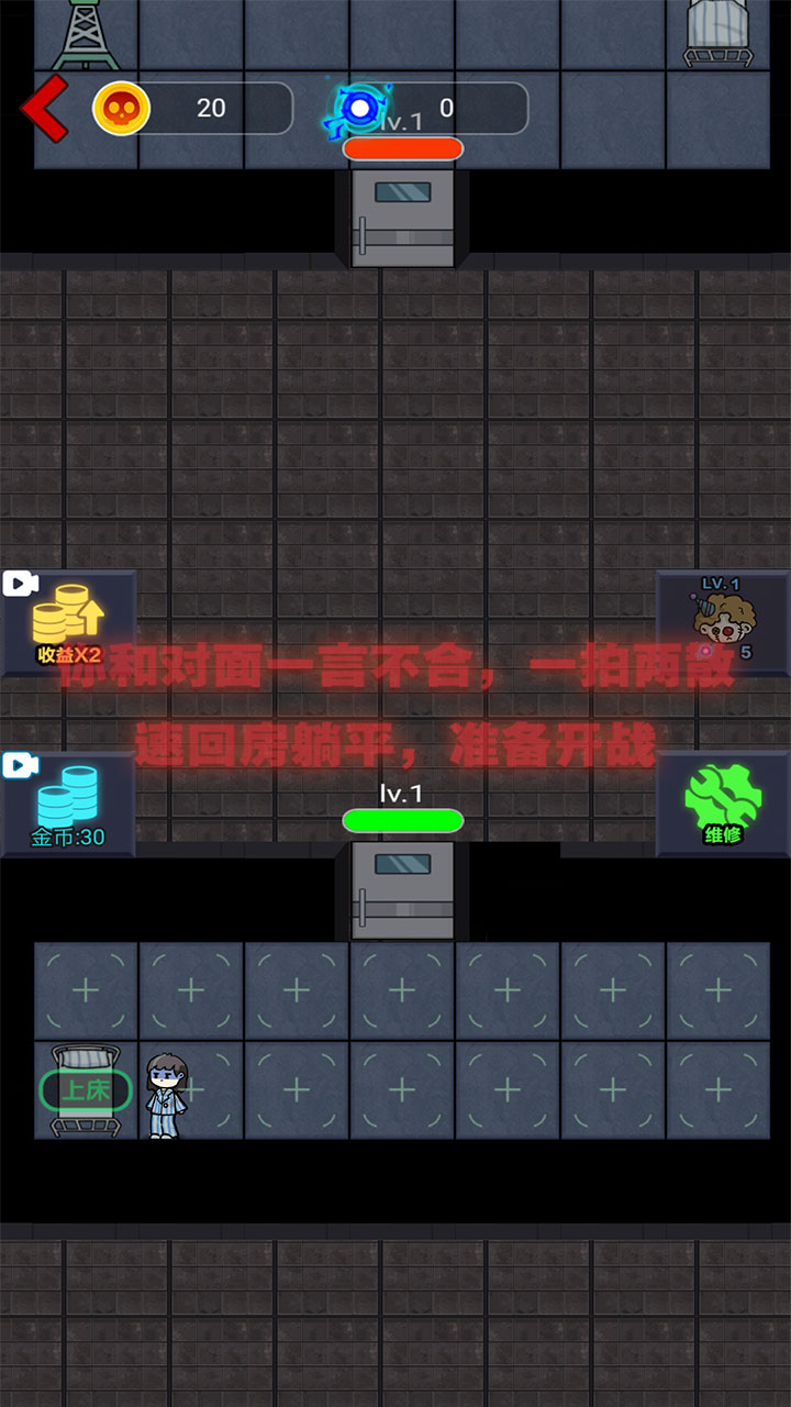 《躺平发育》是一款2D塔防小游戏。游戏中玩家需躲避猛鬼的追捕,寻找适合自己的宿舍躲避,并发展经济建造炮台,抵御猛鬼。