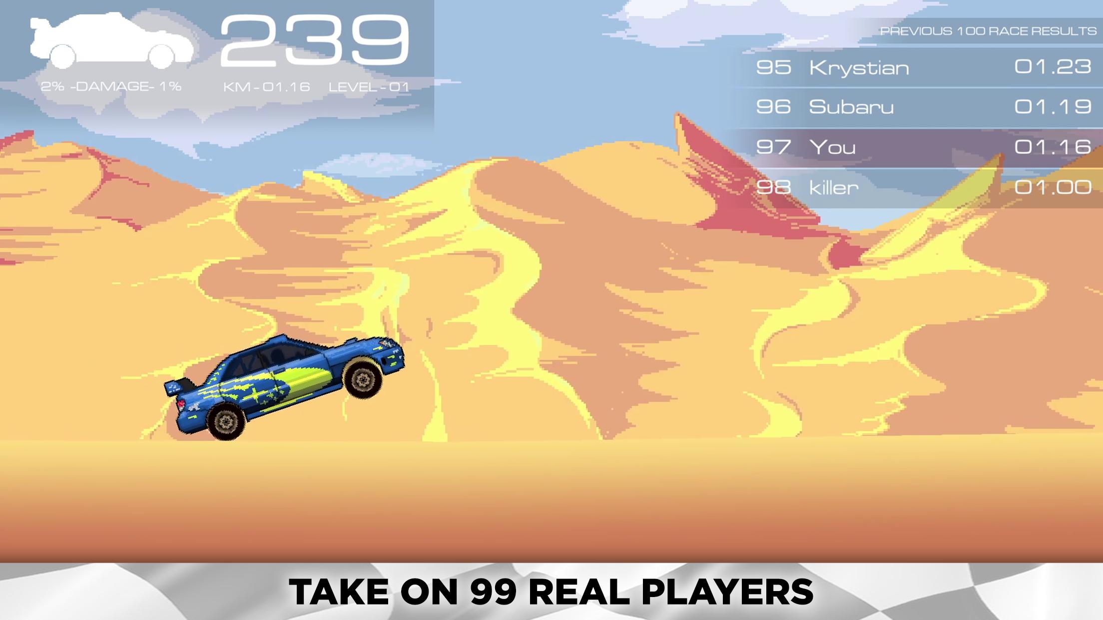 进入像素拉力赛,挑战世界!在炎热的沙漠太阳下进行一场无情的比赛,看谁能在越来越困难的地形中驾驶得最久。与其他 99 名玩家一起在排行榜上名列前茅,在这项技能测试中,您将解锁新车、获得奖励并展示您作为 Pixel Rally 冠军的驾驶天赋!