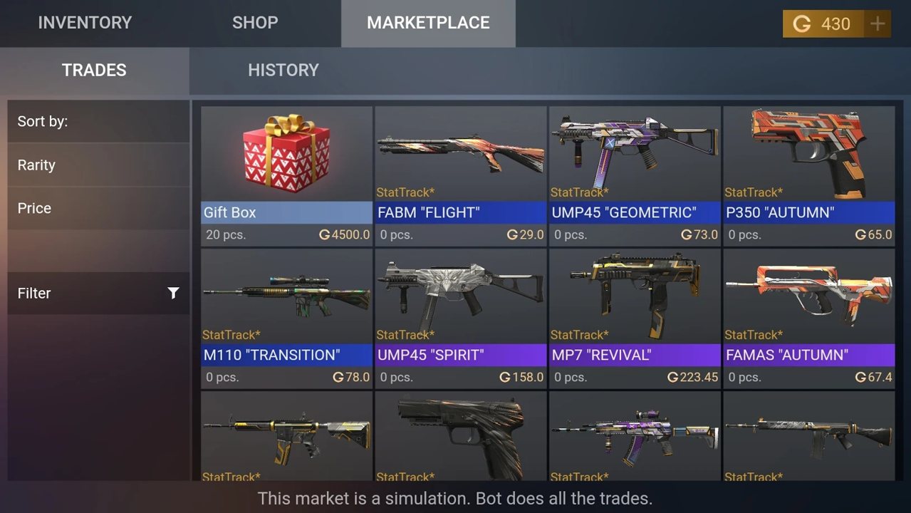 这个免费的案例模拟器包含所有案例和贴纸包。您可以从商店或市场上获得皮肤。收集库存中的所有至宝。有一个Craft函数。这使您可以在同一系列中将皮肤升级到更高的稀有度。