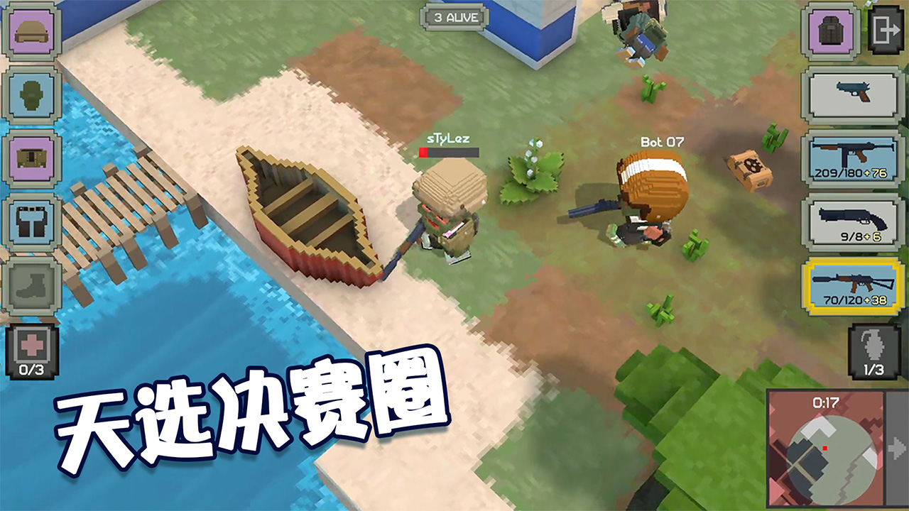 从幸存飞机跳到死亡之岛上、找到最好的装备、消灭敌人。手无寸铁的玩家会分散在岛屿的各个角落,必须找到并使用不同的武器和物品来消灭对手。找到您能发现的最佳武器:突击**、像素枪、冲锋枪、散弹枪及其他武器。逐个消灭对手,主导战场,并成为最后的唯一幸存者!抓起您的像素枪,开始射击吧!