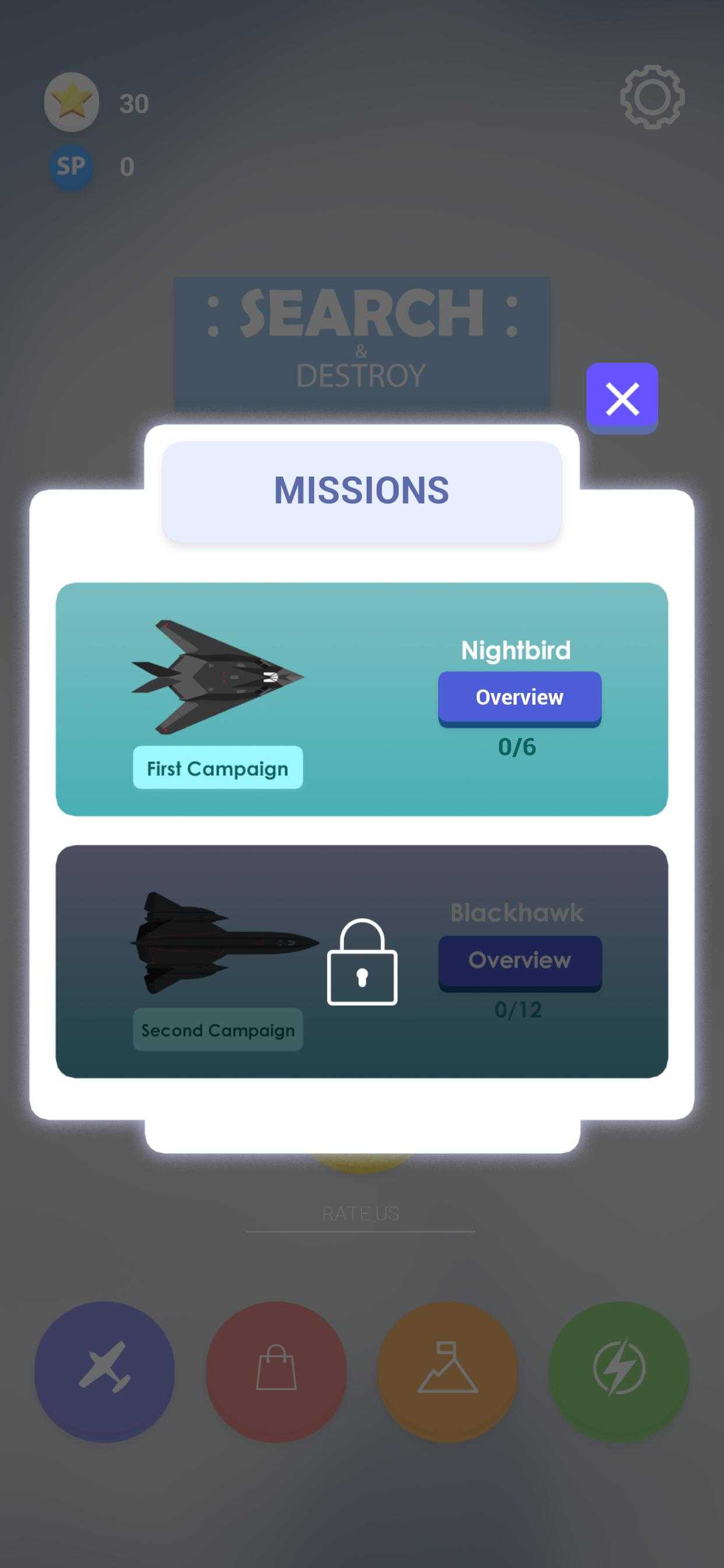 《搜索与摧毁》(Search&Destroy)是一款以军事航空黄金时代为背景的动作游戏,致力于从20世纪初的航空到最先进的现代作战单位。将玩家投入到争夺天空主导权的无休止的战斗中。 驾驶飞机,并遵循虚线,以确保您的火箭瞄准敌机。你以为这么简单?在我们的游戏中,学习飞行很容易,但要赢却很难。你将被迫避免敌对**,湍流区,静态场和许多其他事情。收集星星并用它们来购买新飞机和升级你的飞机。通过升级最大速度、加速度、转弯和闪光参数来扩展飞机的性能。收集像盾牌,升压,FOV,以帮助摧毁和躲避**。