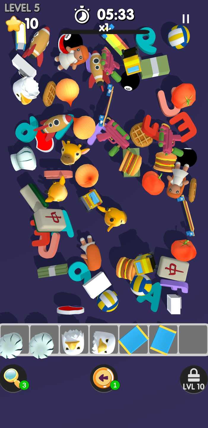 瓷砖玩具匹配3D是一个新的和时尚的免费匹配游戏娱乐所有年龄! 通过在有限的时间内找到并匹配3D项目,你可以增强你的大脑,加快你的思维过程。数百种可爱多样的3d组合等着你! 怎么玩 从一堆乱七八糟的物品中挑出三个相同的3d元素,并消除它们。