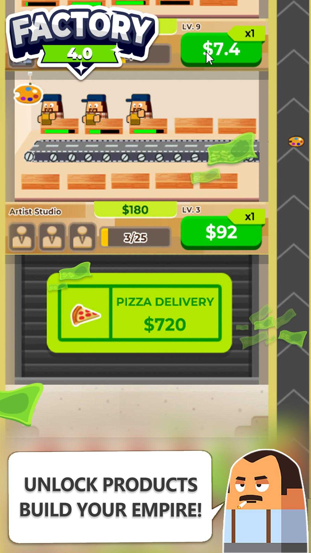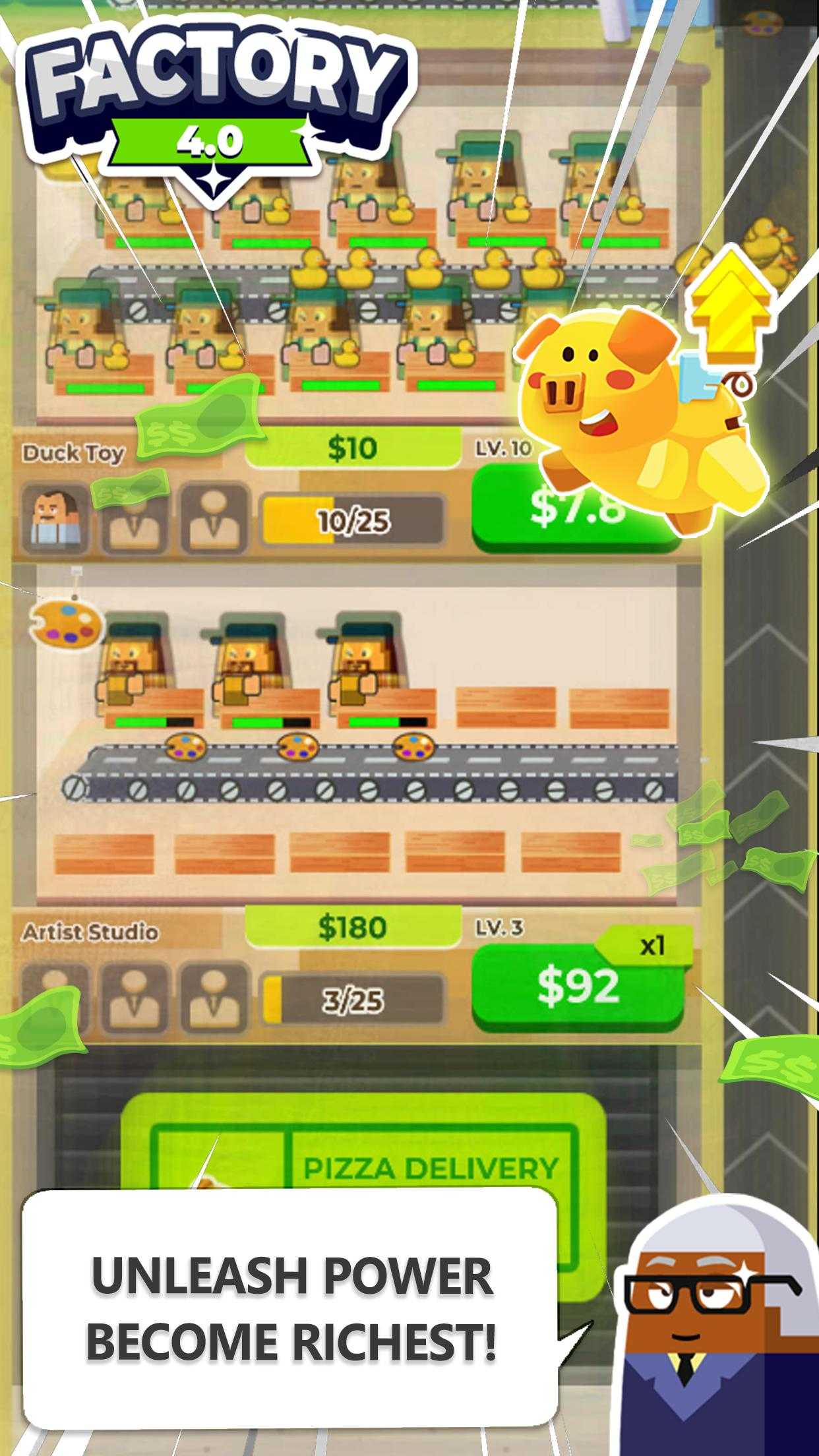 想创业吗? 找闲散游戏? 免费下载和玩工厂4.0 -闲置大亨游戏! 在工厂4.0 -游手好闲的大亨游戏中,你从一个鸭子玩具工厂开始,并建立自己的企业成为世界上最大的企业! 发展你的业务,制造不同种类的产品:鸭子玩具,爆米花,**生活帽,罐头食品,饼干袋和更多! 升级你的产品线,雇佣经理,使用助推器来获得更多的收入和更快的增长。 重置您的进度以获得巨额奖金