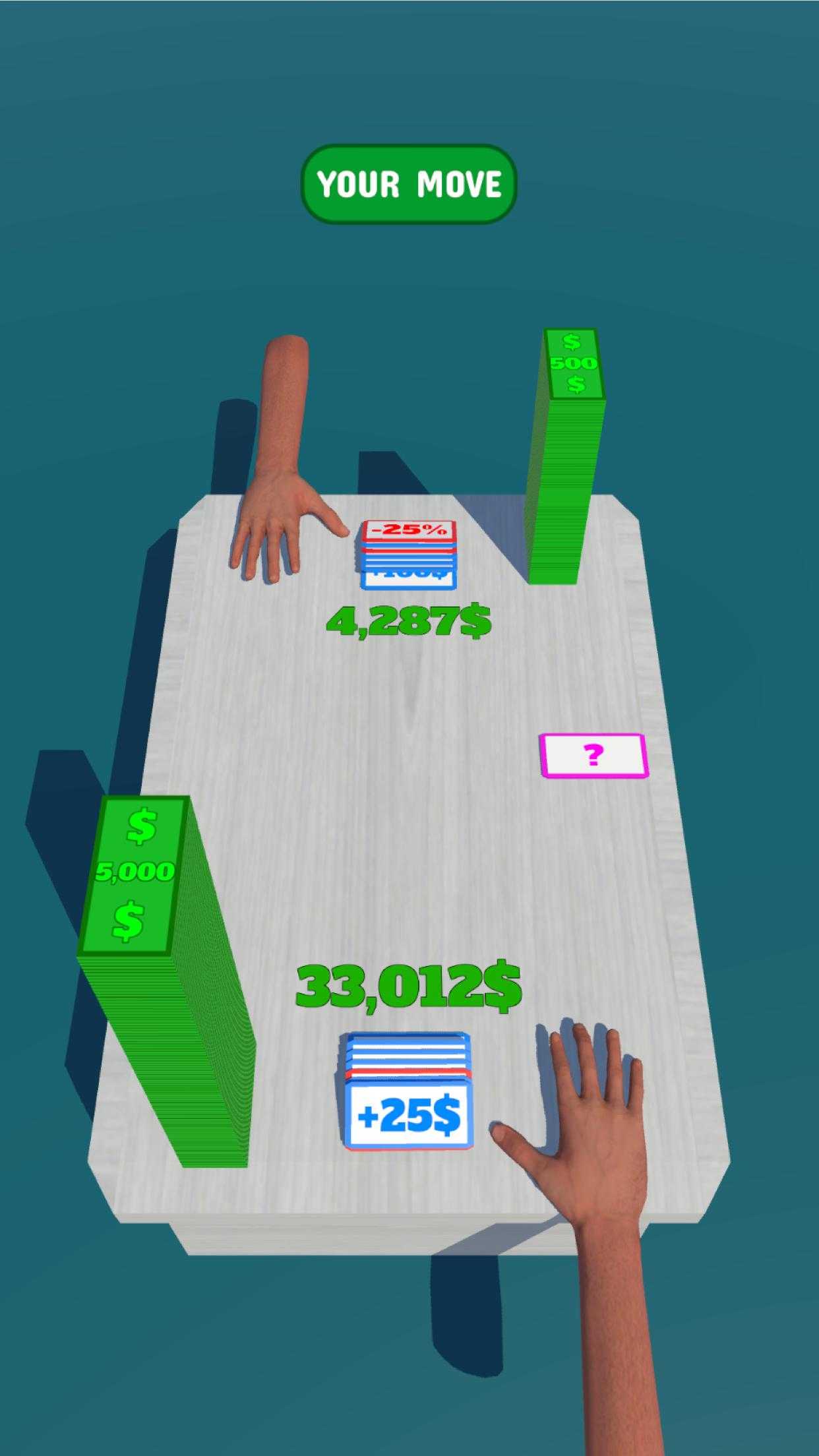 把你的身家弄到月球上去! 首先,玩石头剪子布决定先走,然后通过挑选最好的牌来增加你的钱数,确保你比对手有更多的钱。 只需轻敲一张卡就可以使用了! 不要忘记红卡,你可以通过使用它们来减少对手的筹码,但你的对手也可以,所以要小心。