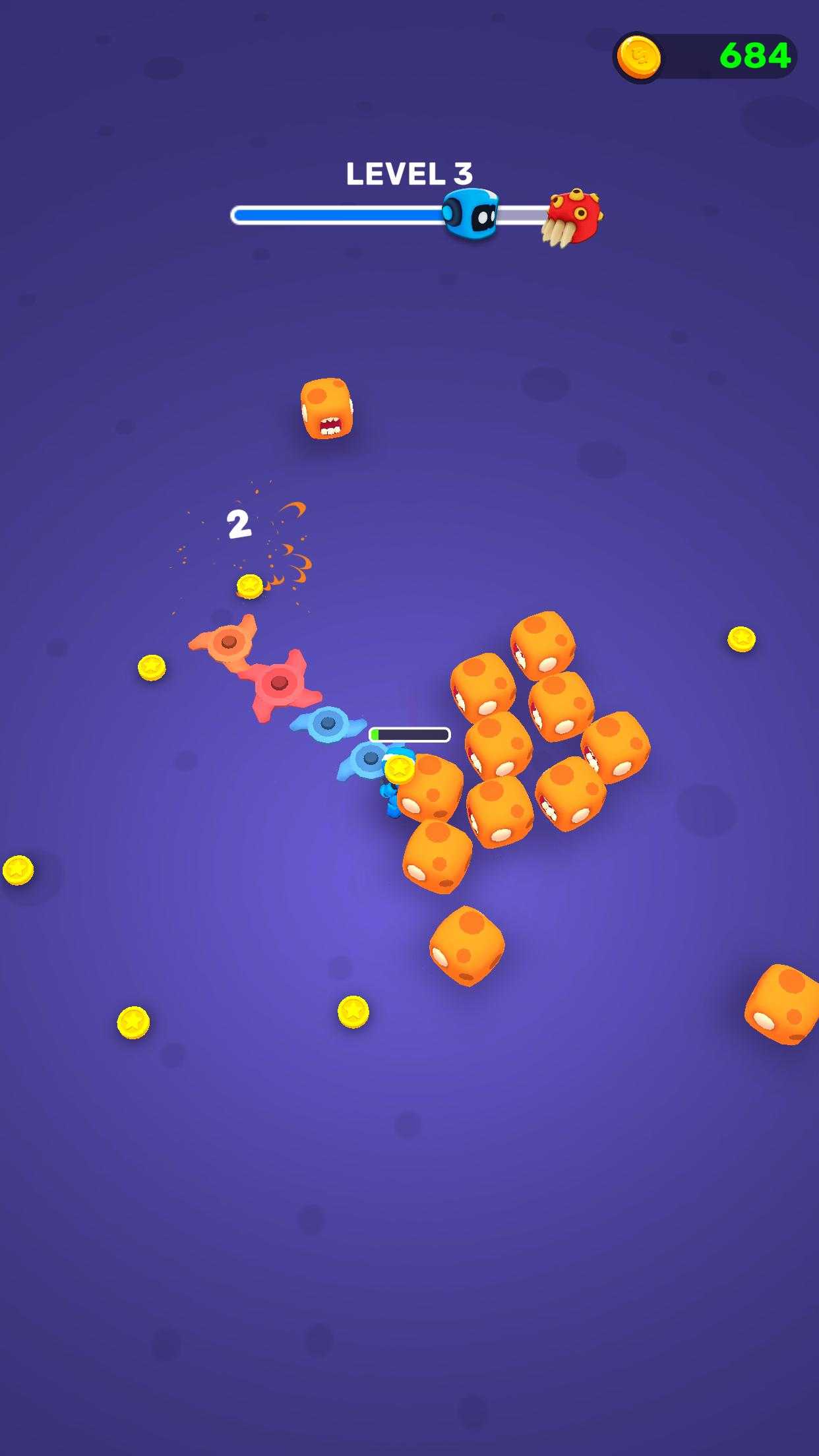 你的角色前面有旋转的刀片。因此,您可以奔跑和旋转以切开敌人。您可以通过更改刀片堆栈的顺序来制定策略。你也可以升级你的刀片。