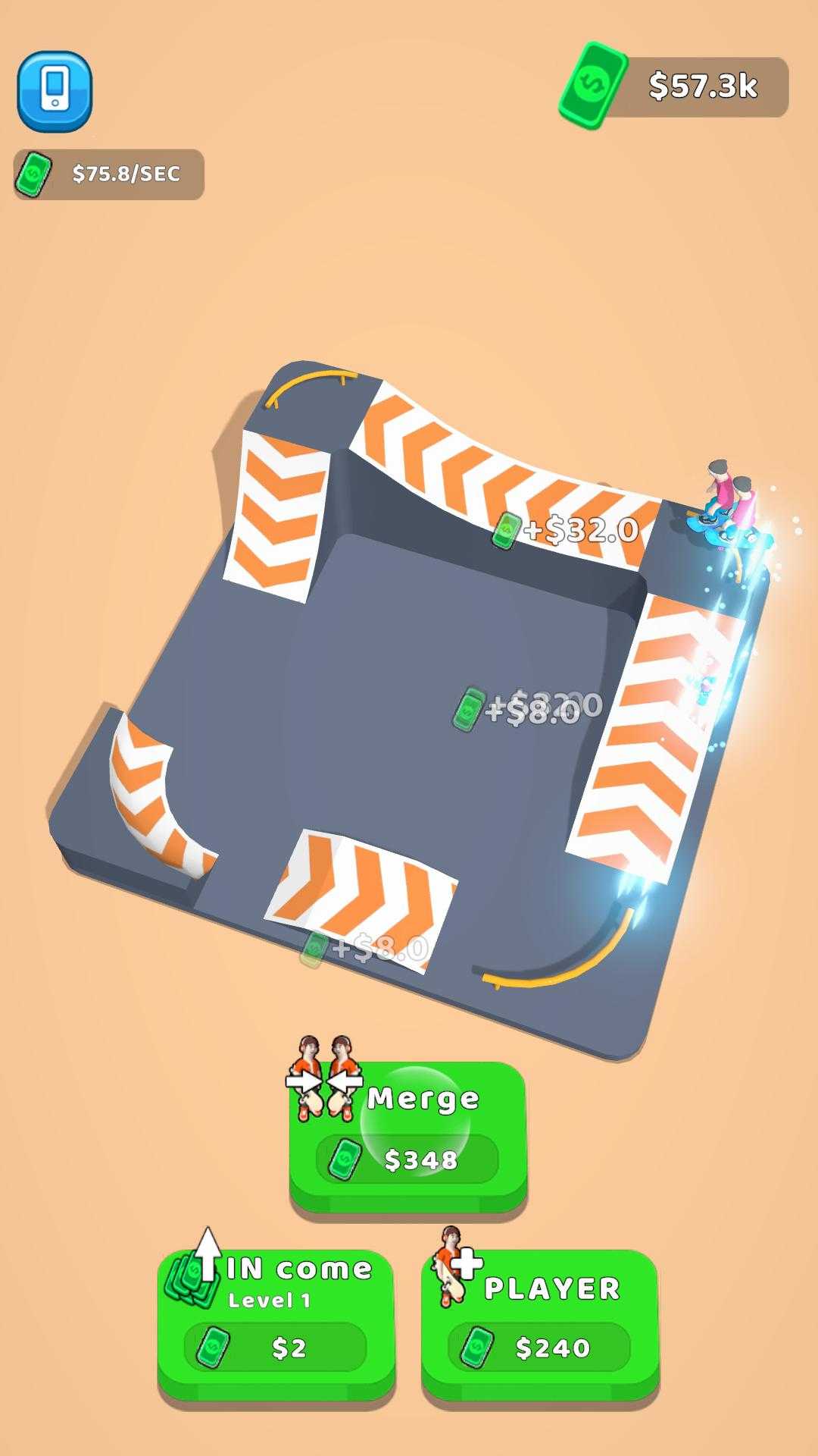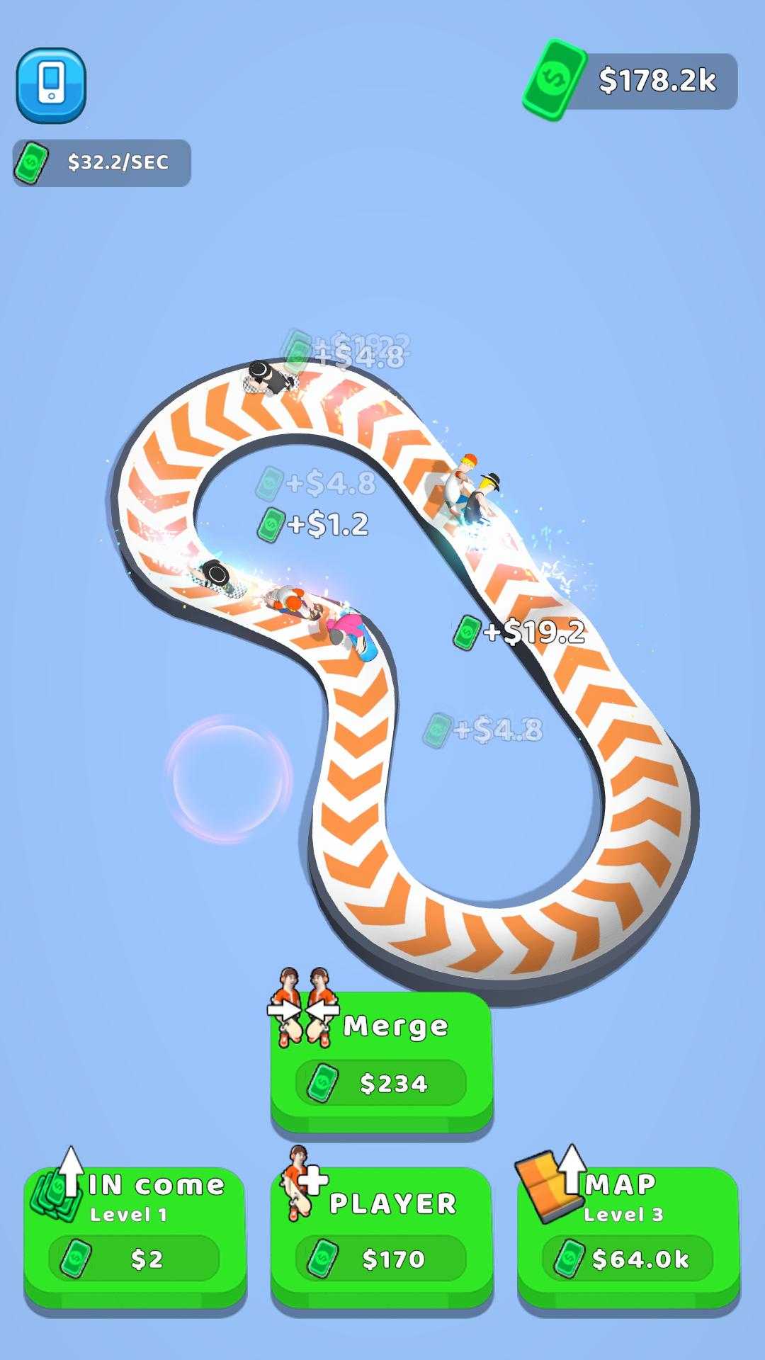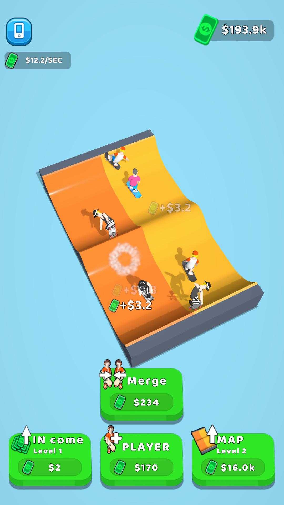 简单易玩的游戏,点击加速滑板手,合并滑板手并升级技能以获得更多金钱,而不是用金钱解锁更多华丽的滑板,希望你会喜欢这个游戏!