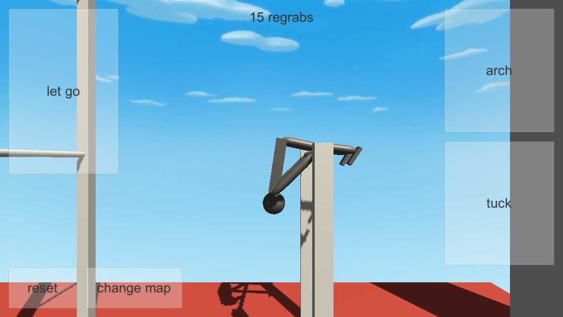 该游戏旨在模拟您可以在酒吧(如跑酷或体操)上进行的翻转。它使用Unity中实现的真实物理原理,因此从理论上讲,您可以做很多事情。玩得开心,如果您有任何反馈意见,请告诉我!