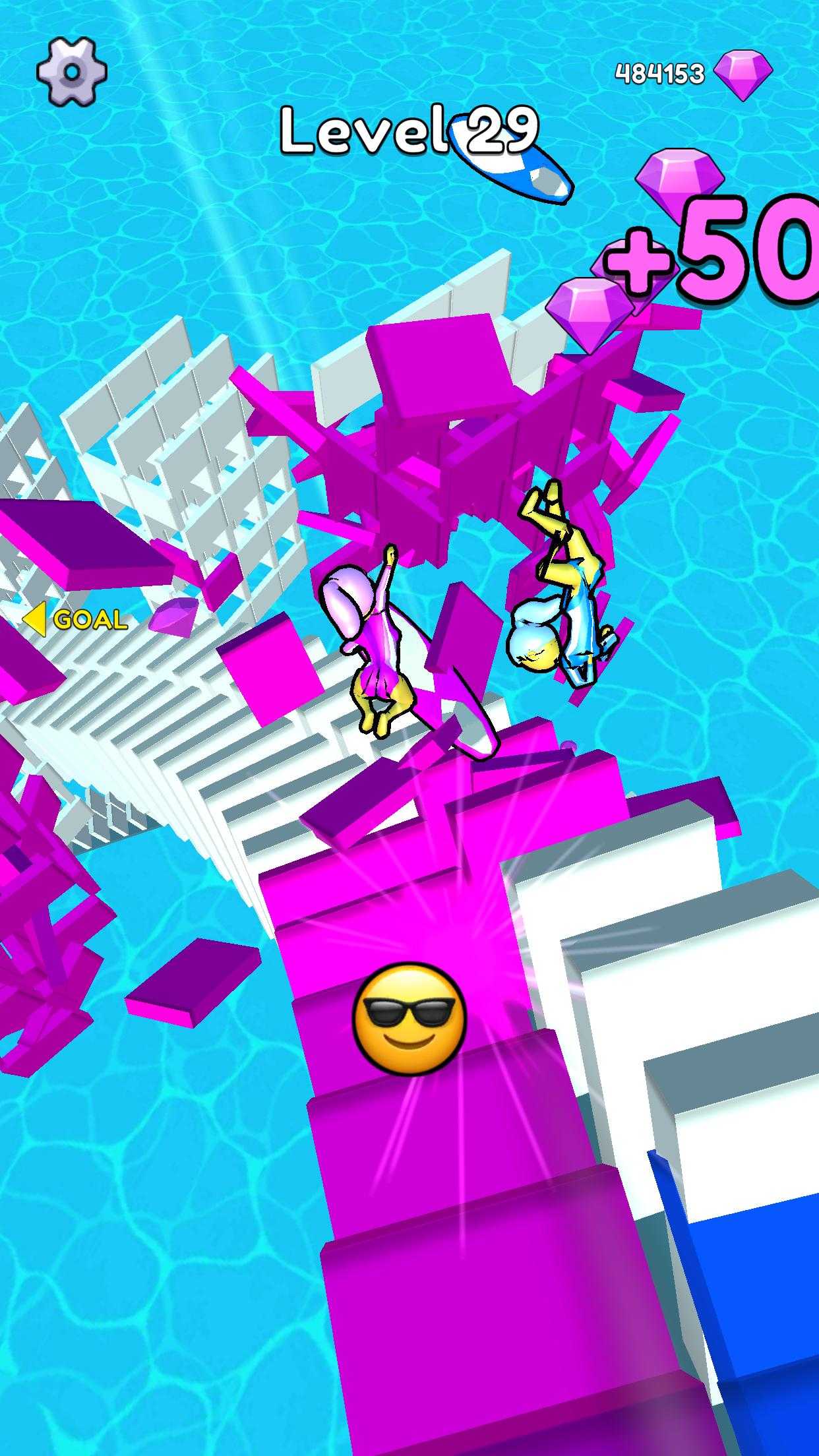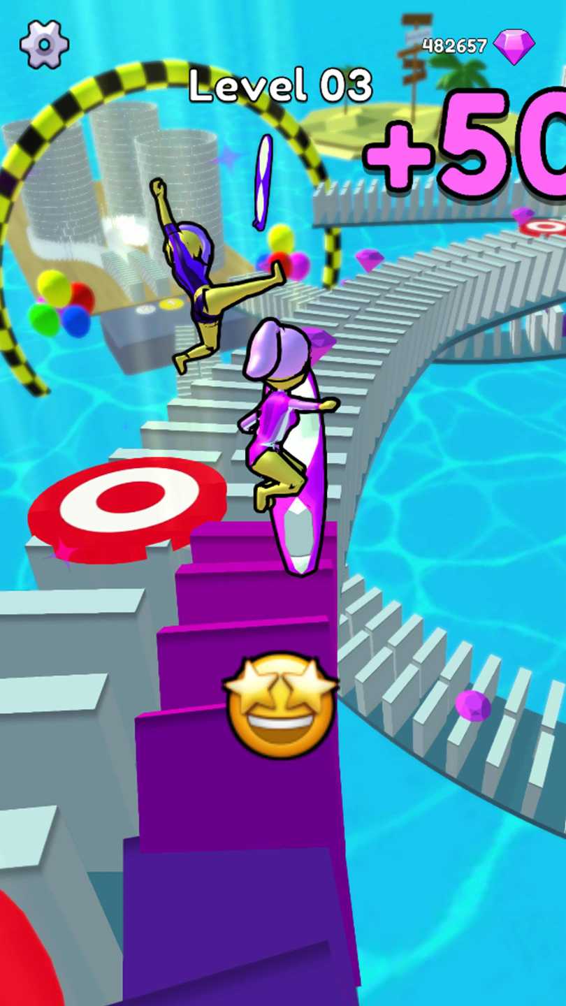 沿着多米诺波浪冲浪,因为它们在您的板下坍塌。将其他冲浪者推离赛道以消除他们。 跳下赛道以领先于其他人。当没有人敢跳时,找到最聪明的捷径。