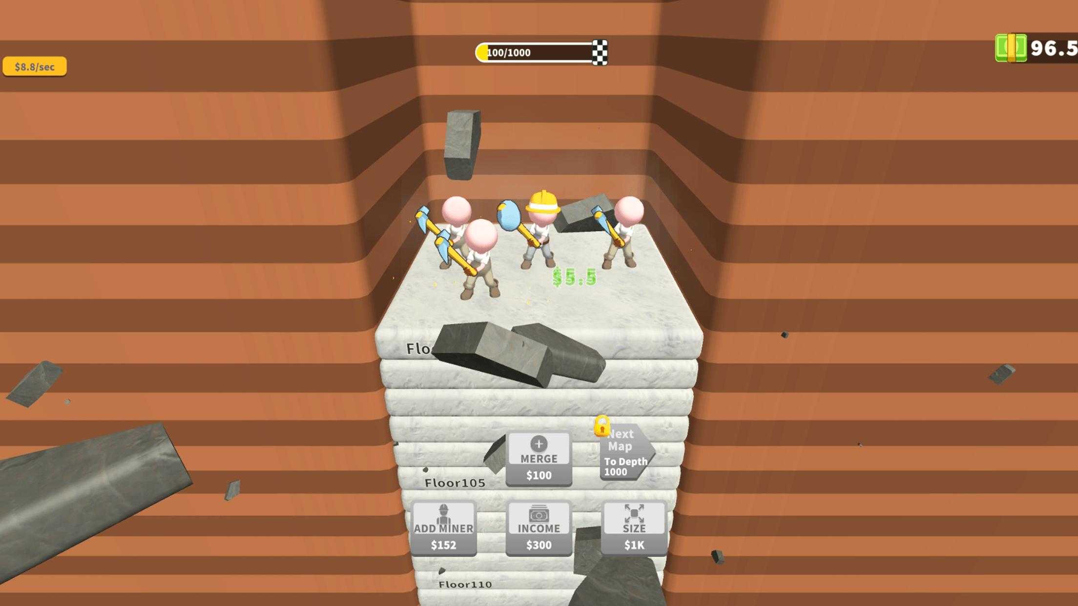 通过雇用矿工开始挖掘并获得第一笔利润。通过将角色合并在一起来升级角色以获得更多收益并更快地挖掘。但要小心,传说有怪物生活在地底深处......无论如何,跟上步伐并记住 - 努力总会有回报!