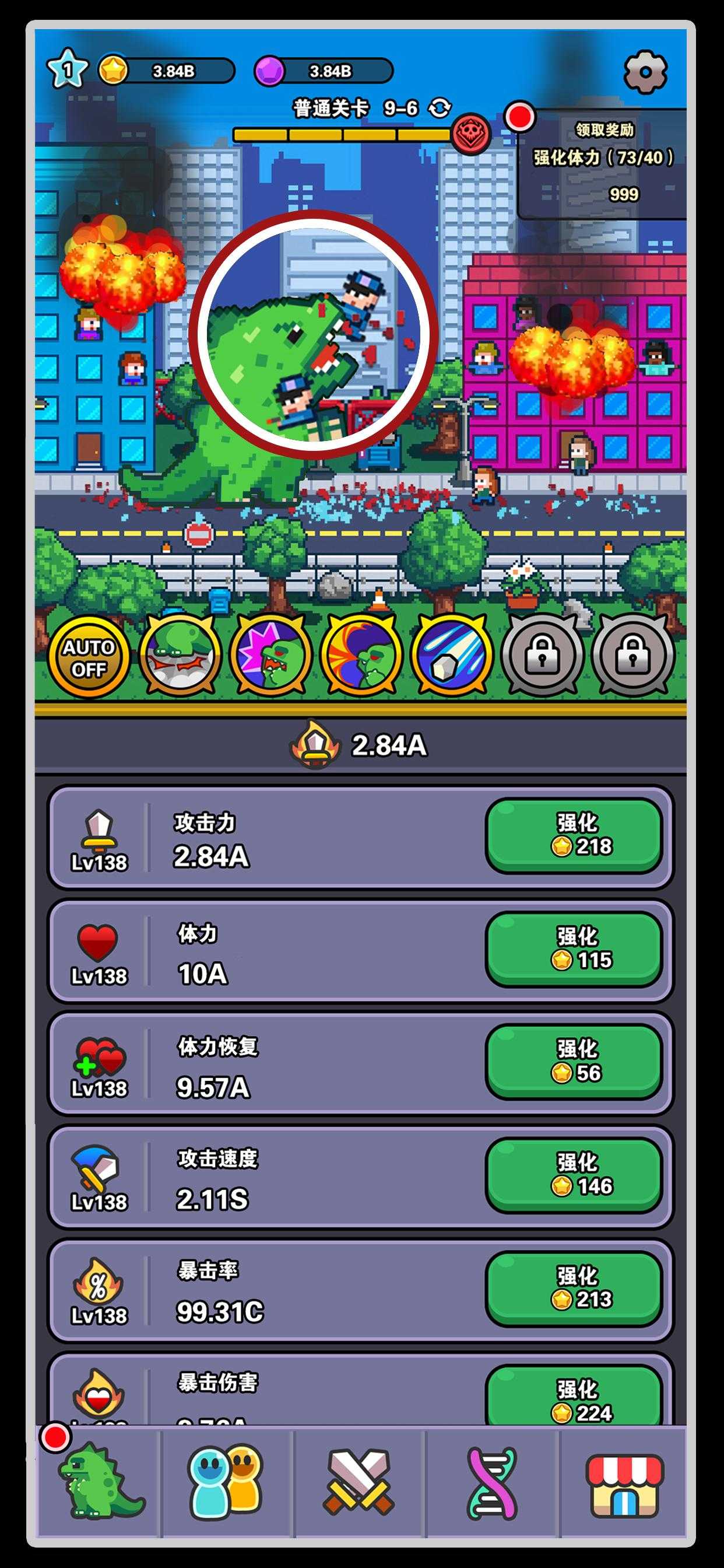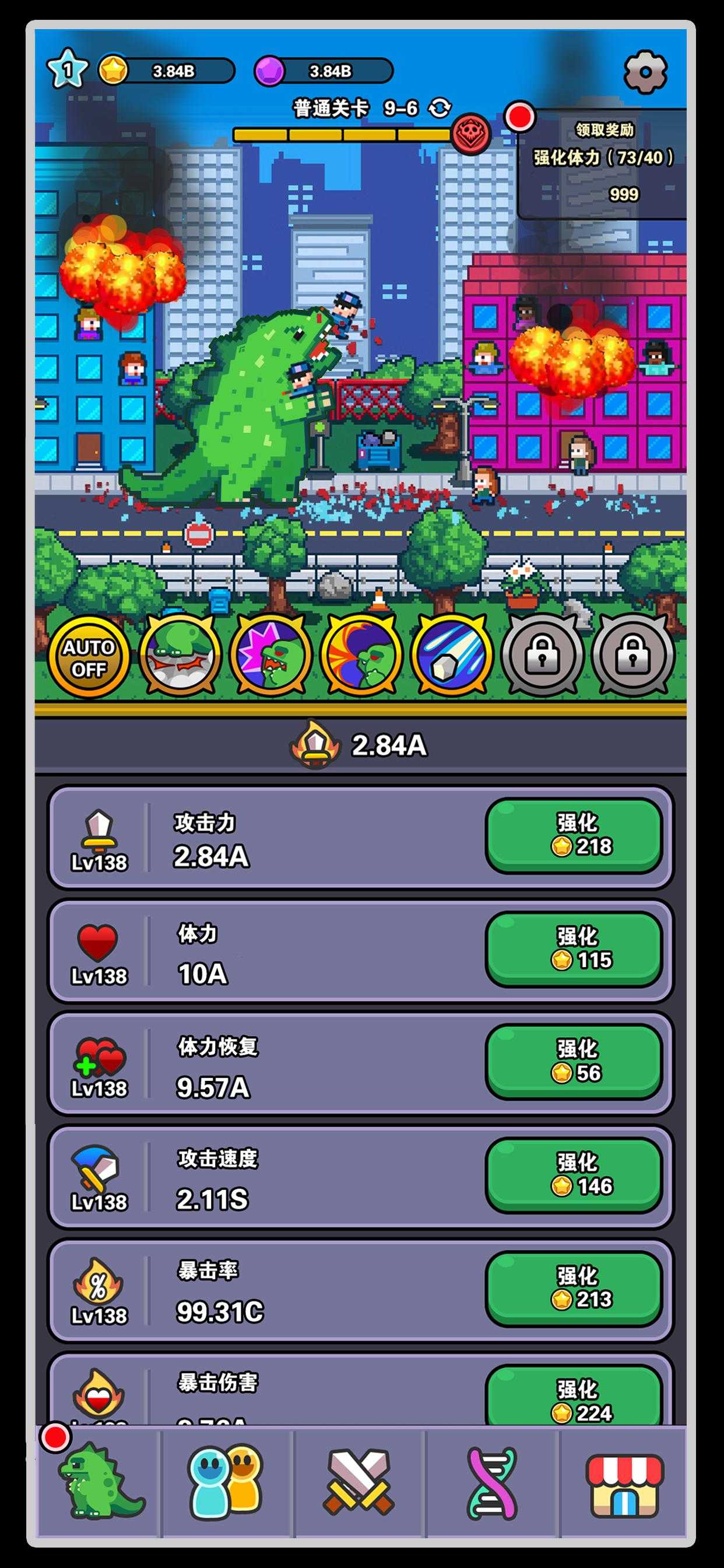 混乱!破坏!恐龙!在全新的闲置破坏游戏《传奇怪物》中,没有什么可以阻止您的横冲直撞。升级你的恐龙,升级你的设备,释放你的技能,粉碎他们扔给你的一切! 在过去,恐龙是地球的强大统治者。他们辉煌的统治持续了数百万年,直到发生了一场大灾难,导致他们消失了。随着时间的推移,人类登上了王位,但他们的行为只会导致全球灾难!现在,恐龙回来了,向人类展示他们的错误,或者摧毁一切尝试! 经典的 2D 像素艺术 - 细致的艺术使您的屏幕上的破坏栩栩如生!在细致的像素荣耀中查看直升机、建筑物和爆炸 获得巨大的力量 - 在人类世界横冲直撞,以获得金币并升级不同的统计数据,如生命值和伤害,以释放更多的破坏!获得大量不同的设备,使自己成为真正的恐龙之王