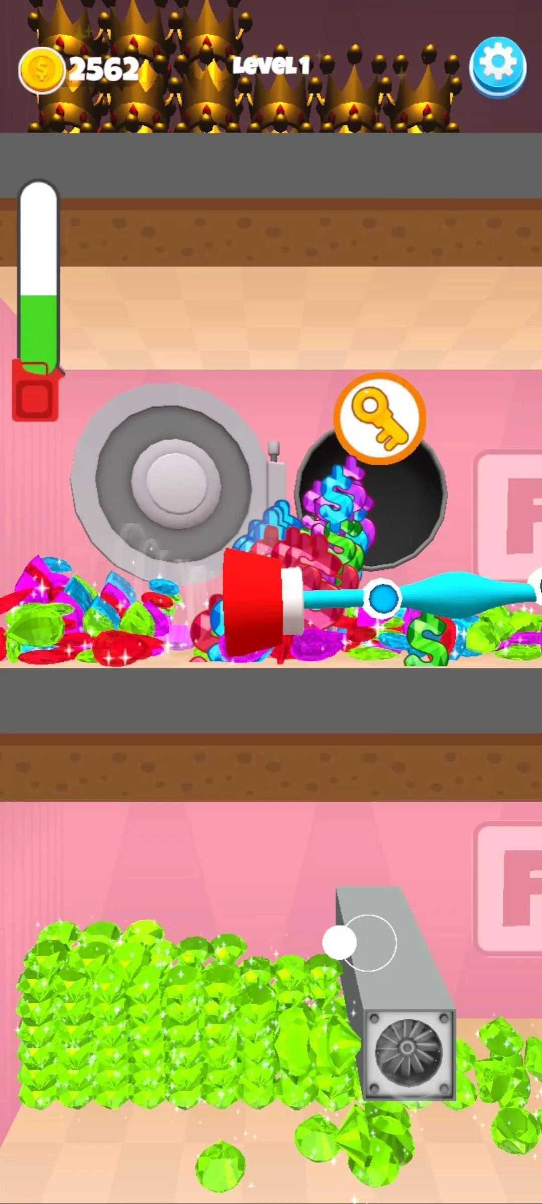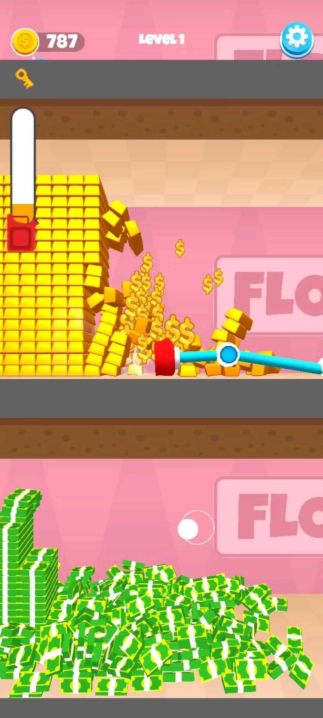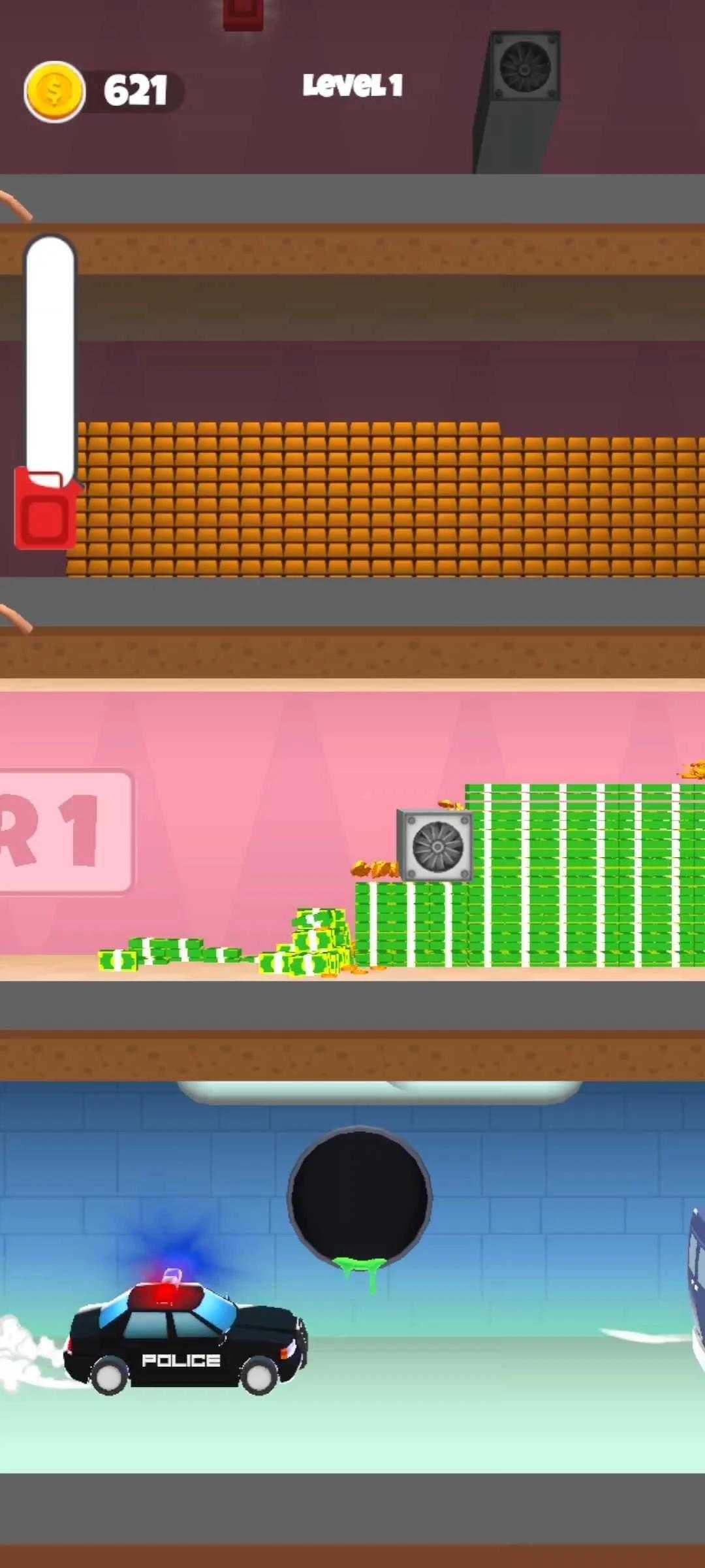 使用您的工具吸走堆放在银行地板上的物体和金钱,然后到达顶层以移动到下一家银行。