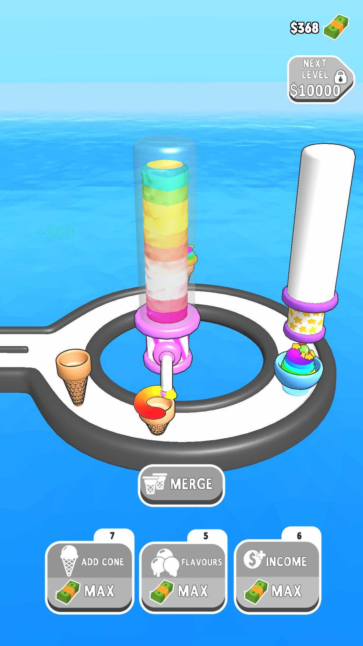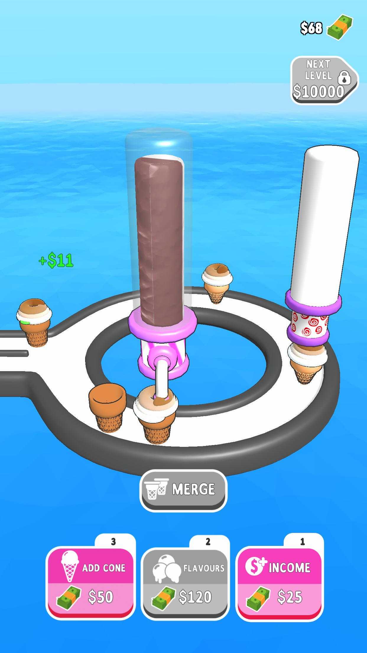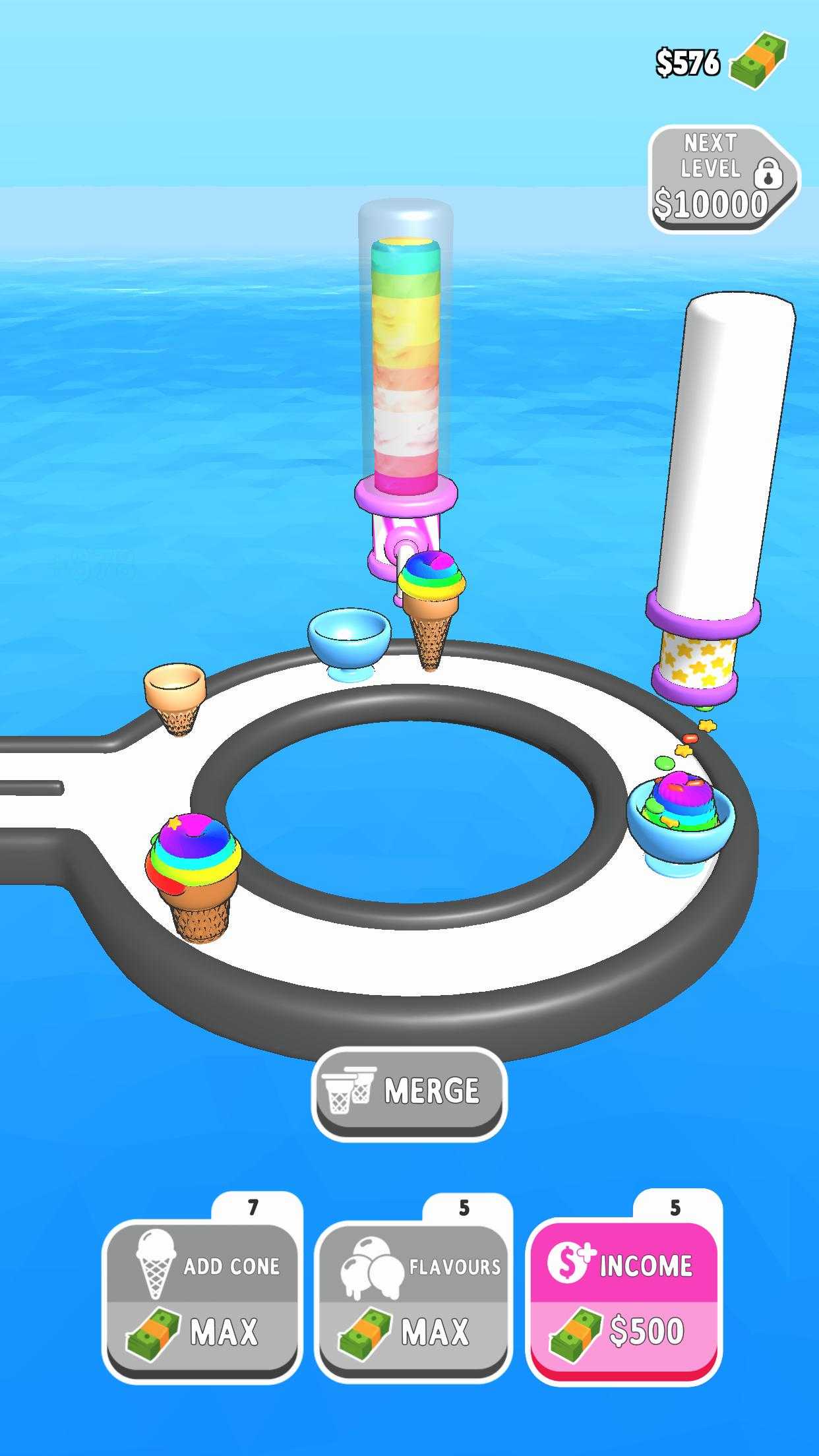 创建您的冰淇淋并出售!确保他们在上面得到一些糖果,并用赚到的钱购买新的甜筒!合并您的锥体并获得更多美味的锥体。