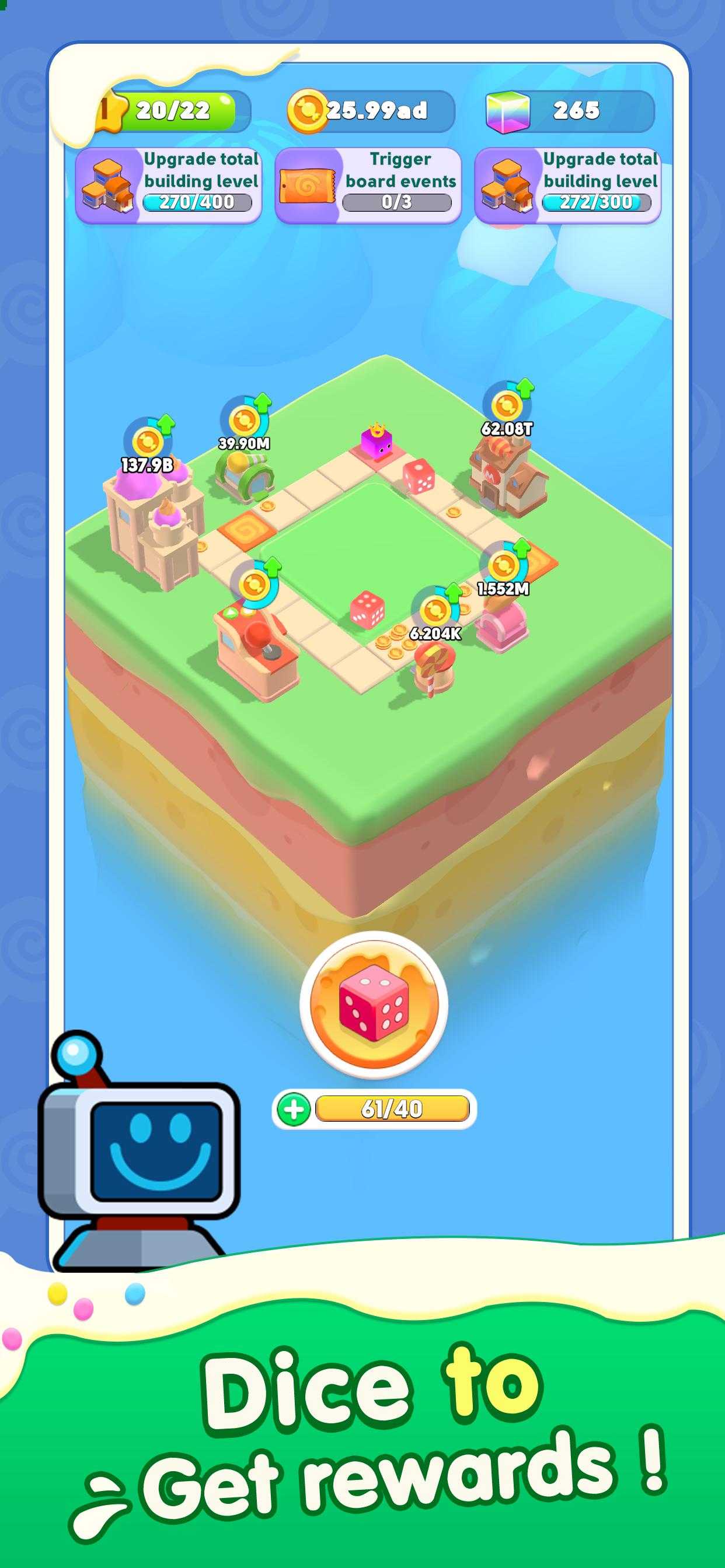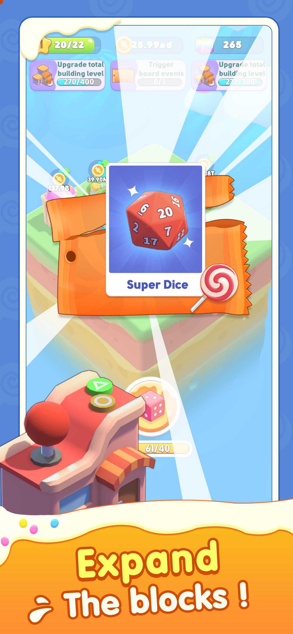 欢迎来到空闲糖果帝国: 当您前往糖果帝国时,全新的体验即将到来! 在魔法面板上滚动骰子,获得糖果硬币和魔法立方体,建造你的商业街并前往不同的土地,击败入侵者,成为最强大的糖果帝国!
