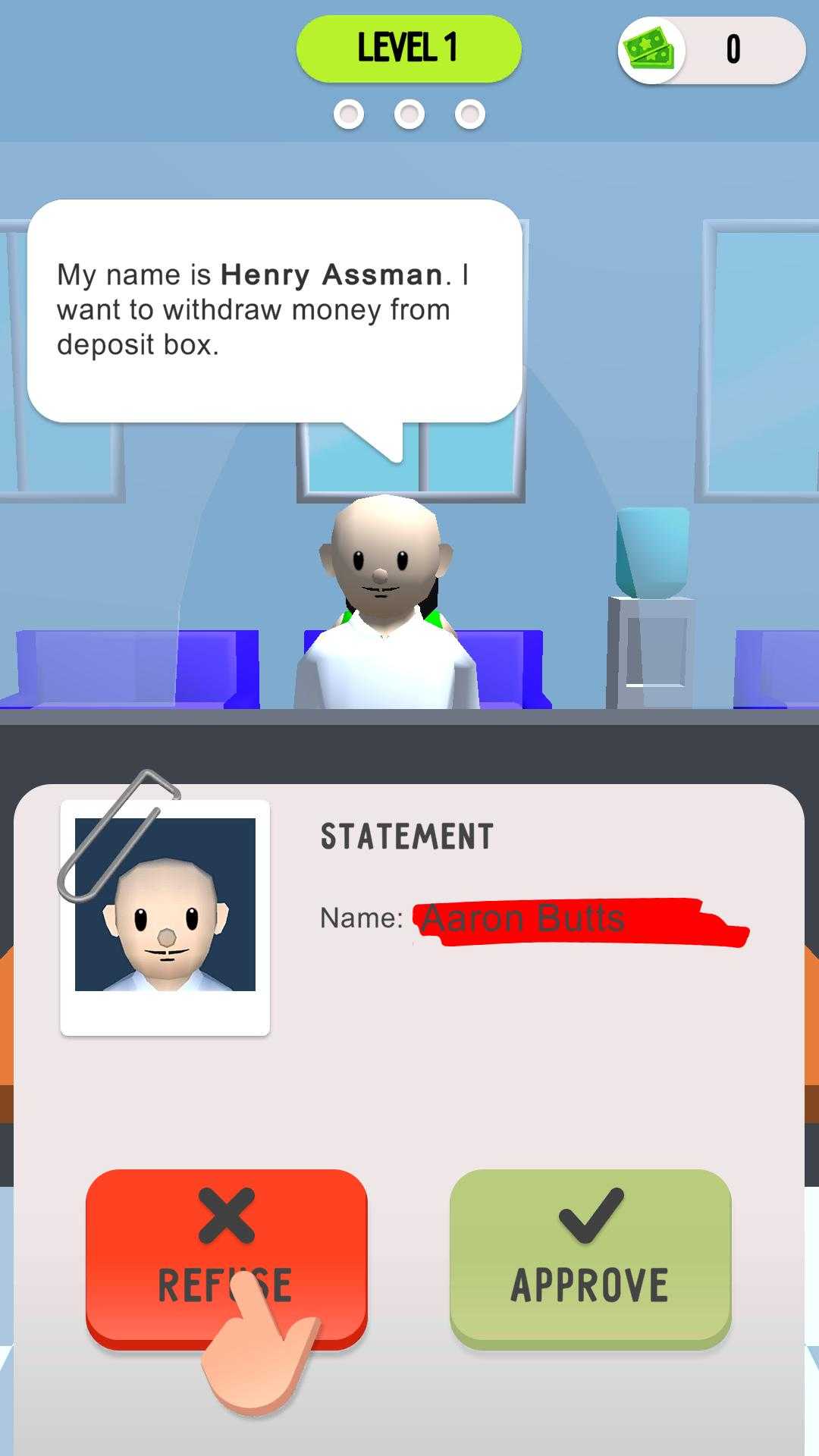 欢迎来到 Money Please - 银行游戏。这是一款银行模拟游戏,玩家在其中控制决定向谁付款的银行员工。如果您喜欢“请钱”游戏、银行游戏和银行模拟器,那么您会喜欢“请钱 - 银行游戏”。客户会问你 - 请给我钱。这是一个真正的银行模拟器,您必须小心。检查客户的文件,并将其与银行游戏中的文件进行比较。在银行游戏中做出决定之前,请考虑多种选择。银行的成功取决于您对 Money Please - Bank Games 的关注。在“请”游戏中,有很多客户在等你 - 男人、祖母、有着不同故事的学生。