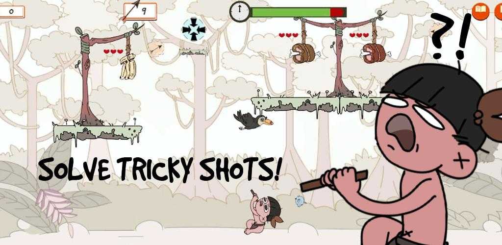 掌握并抓住所有食物!作为村里的冠军射手,你的任务是为部落的其他成员提供食物。击落拿着水果和肉的绳子,把它们带回来! Jungle Trouble是一款丛林冒险游戏,可为您带来弹弓游戏的所有乐趣,其中准确性是您通过所有级别所需的终极技能。击落绑在高处的水果和肉类。瞄准并使用正确的功率来获得正确的角度来击落食物。您将使用强大的吹枪和飞镖射击,而不是愤怒的小鸟! 要玩此游戏,您需要先瞄准吹枪。接下来,您必须向角色后面滚动,以增强您的射击能力。请记住,射击飞镖时需要考虑拱门。不同的角度和力量将使飞镖以各种轨迹射击。在不同的地区和难度下完成你的丛林奔跑!