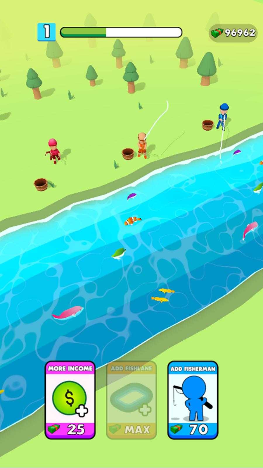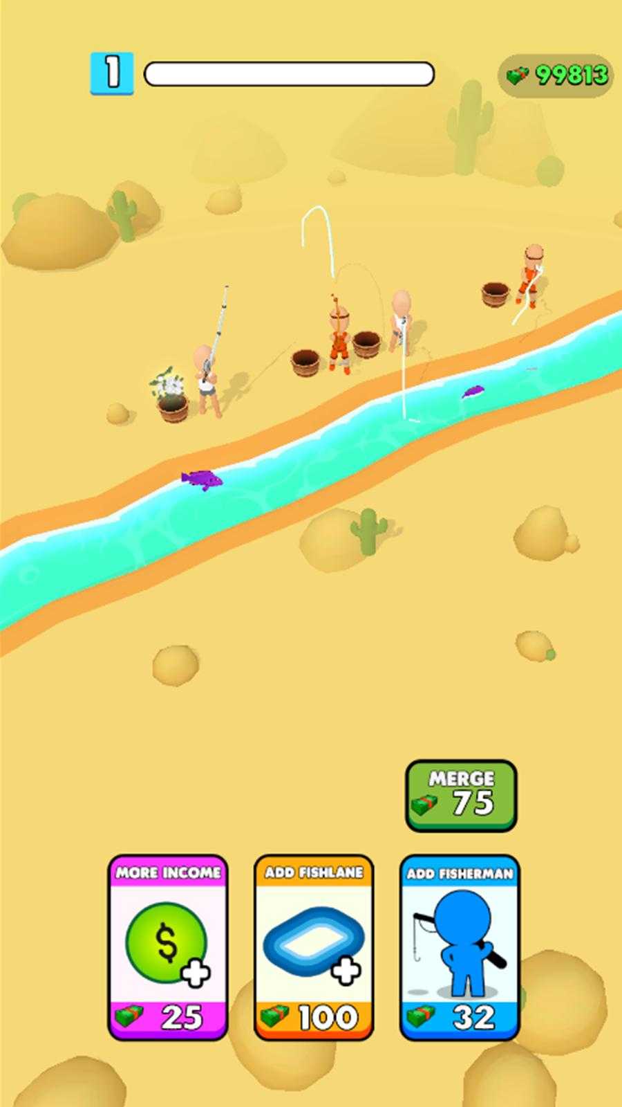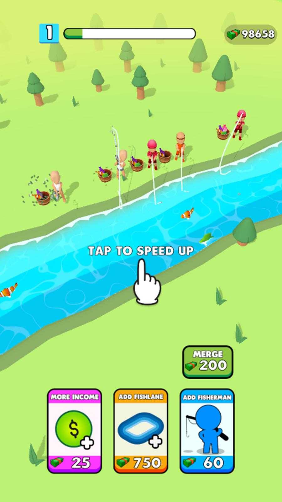 点击以加快鱼的速度,使渔民更快地捕鱼。召唤更多的渔民并赚取更多的钱。如果您合并两个相同级别的渔民,渔民将一次捕获更多鱼。