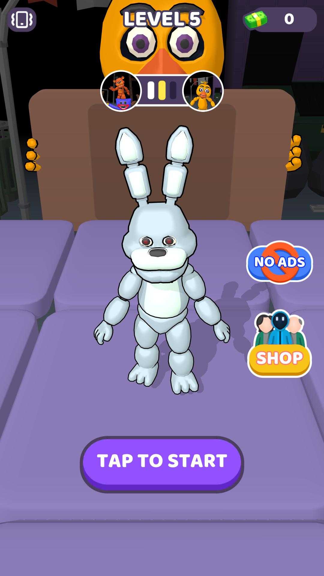 您是否已准备好要与(玩具熊的五夜惊魂)的英雄们进行对抗了?在io竞技场上满场飞奔、选择停留在正确的砖块上,注意别掉下去!快来游玩熊熊派对、享受无穷乐趣,并成为最后一位生还者吧。 在这款休闲io游戏中,您的主要目标便是在充满敌人的竞技场中生存下来。若想存活五个夜晚,您必须天赋异禀并且下手稳准狠!猜中正确的砖块、迅速跑向该处,并将其他玩家推出竞技场外。 规则简单易学。只要停留在与主持人手中卡片上图案相同的砖块上即可。不过请小心!其他所有的砖将在几秒内消失。尽可能存活过多回合,不要掉下去呀!