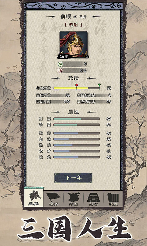 三国人生模拟》是一款以三国作为背景的开放性人生类模拟游戏,在这里你能以不同的视角去参与并感受各个势力之间的斗智斗勇,你可以选择武将的身份征战沙场,可以选择谋士的身份出谋划策,也可以以贤臣的身份治理地方等等,另外游戏中各路名臣名将也将有机会被你结识甚至为你所用,协助你完成自己的人生目标。