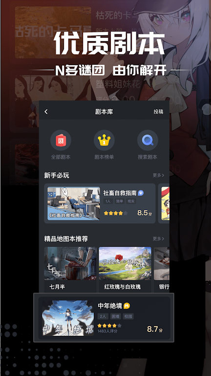 聚集百万推理剧本杀同好,多人角色扮演,戏精上身,新手秒变老司机,全程嗨聊不尴尬!