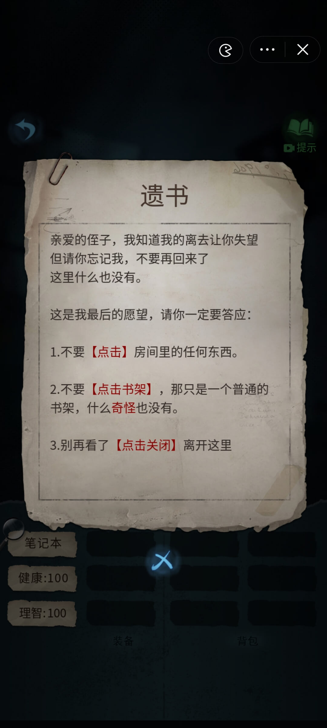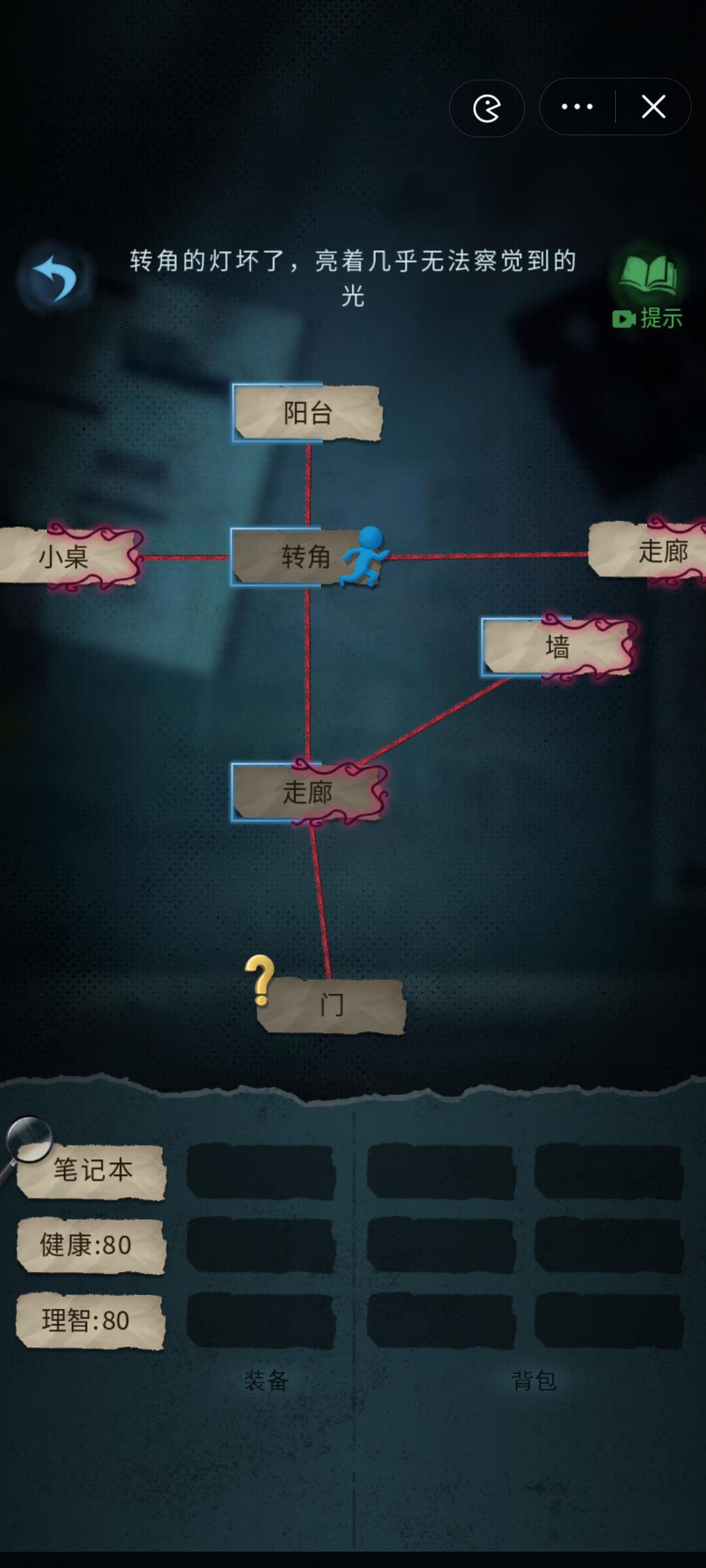 点击文字节点,探索世界寻找线索,并使用道具来与世界交互,最终解开谜题,发现事情的真相。(结合游戏《文字逃脱》的解谜玩法和规则怪谈的恐怖故事)