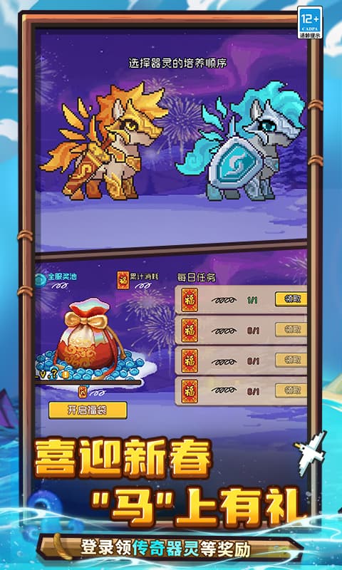 1.「新春庆典」:新春庆典活动开启,包括召唤小马、瓜分宝石、新春红包、春节小铺等多个模块,参与活动可免费获得活动限定传奇器灵"翻羽之灵"&"奔霄之灵",完成每日任务获得福卡,可用于开启福袋奖励&除夕夜瓜分蓝宝石。