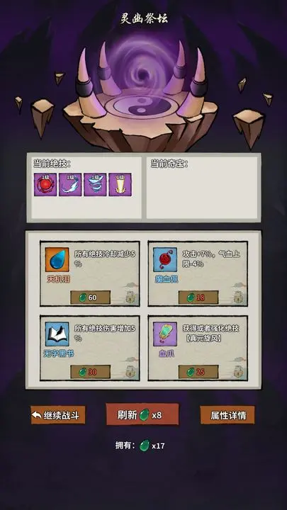 肉鸽跑酷的战斗中,你可以选择成为道士/剑客/甚至尝试入魔。然后提升道行,强化不同的绝技/灵宠/奇宝,选择你自己的路线方向,斩杀诡异的僵尸或强大的邪魔妖道。