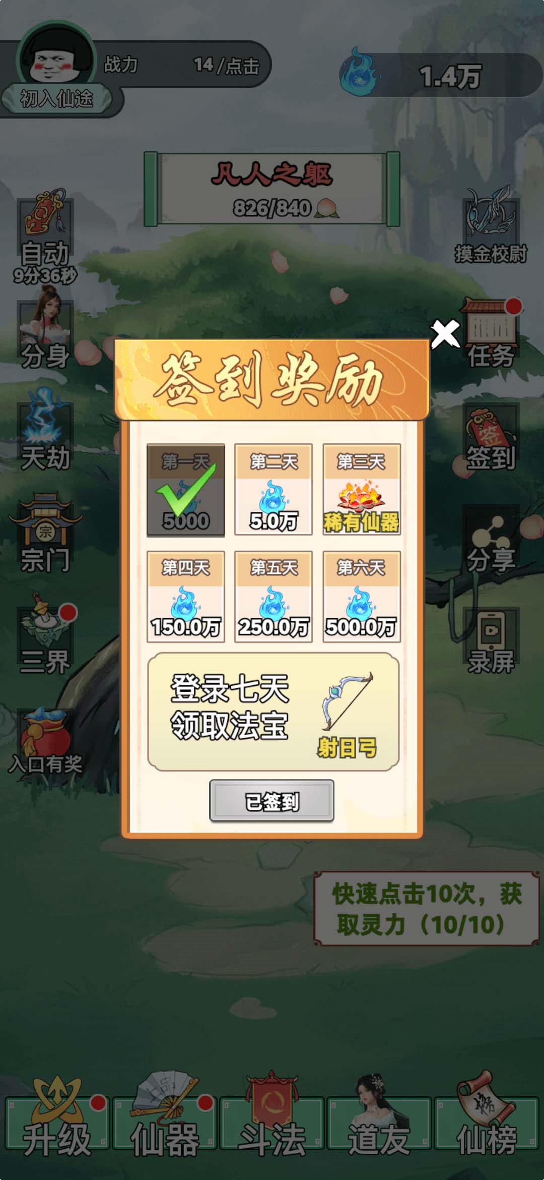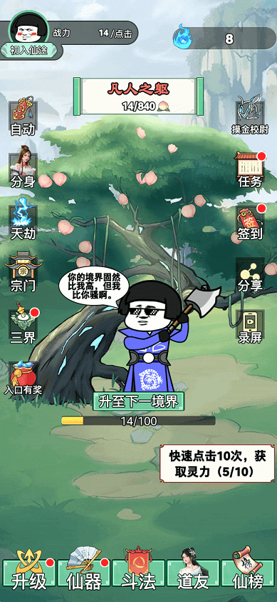 游戏中构造了一个砍树就可以获取蟠桃,然后提取灵力修仙的世界。在这个世界中主角需要一直砍树才能获取源源不断的蟠桃,从而以此为货币来突破境界。在突破境界后还可以与npc斗法来获取地位等级,和其他奖励。