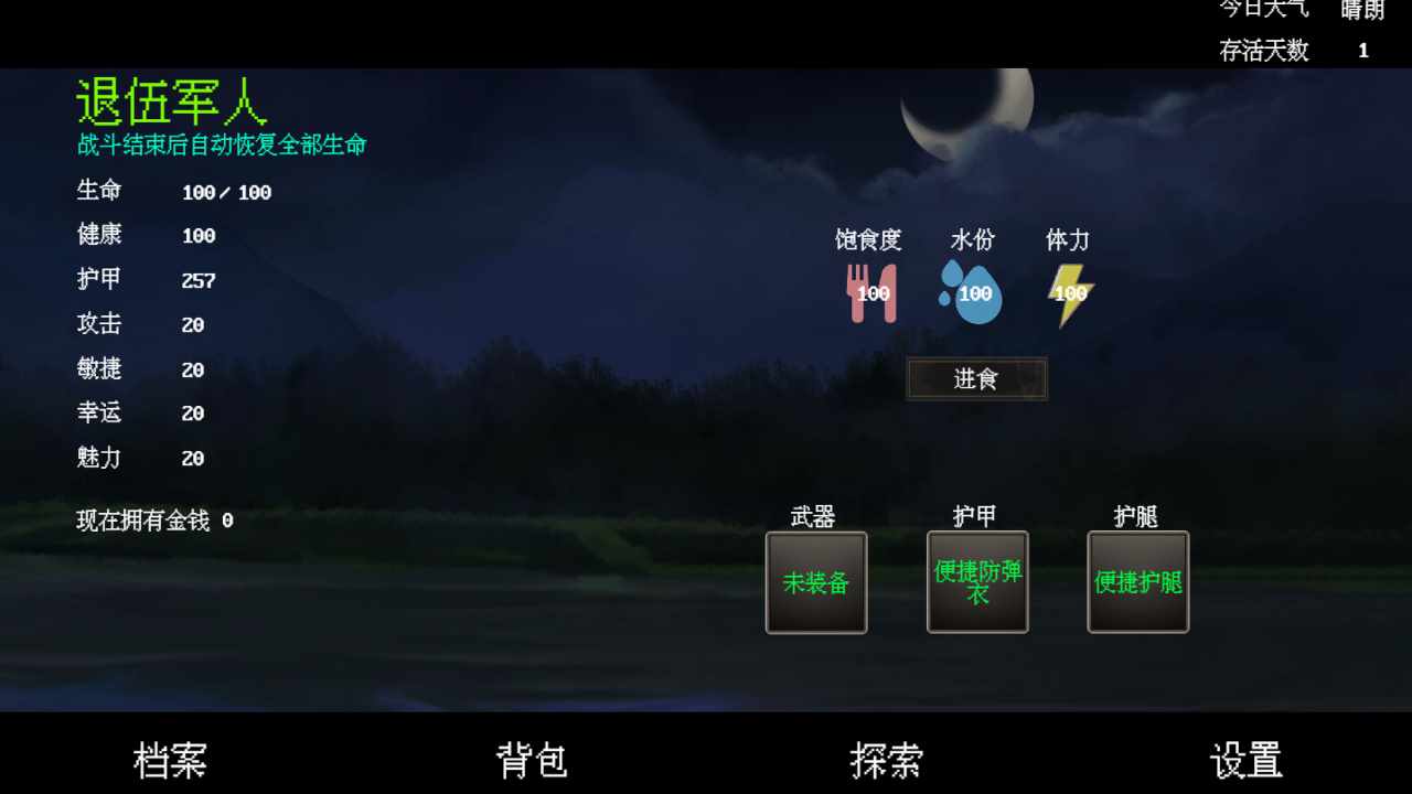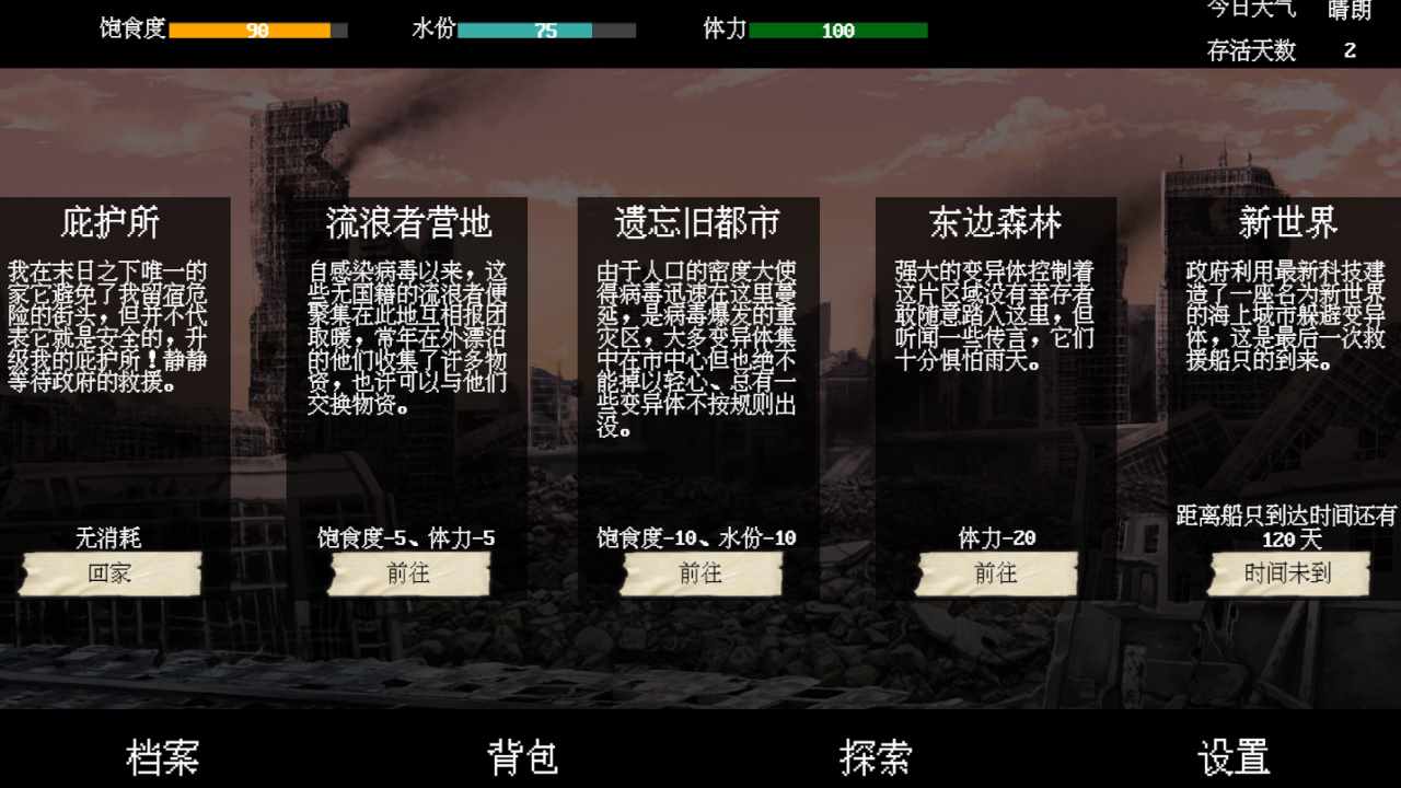 听闻这个消息后我再次燃起渴望生存的希望之火,我需要在接下来的120天内,抵挡变异体的进攻,因为无线通讯设备传输的电磁波会吵到隐藏在东边森林里强大的变异体。但我不能关闭它,因为我需要它接收避难所之外的讯息。每10天变异体会对我的避难所发起进攻,我需要收集食物和水源的同时,收集材料升级我的避难所,从而面对这些变异体的进攻。