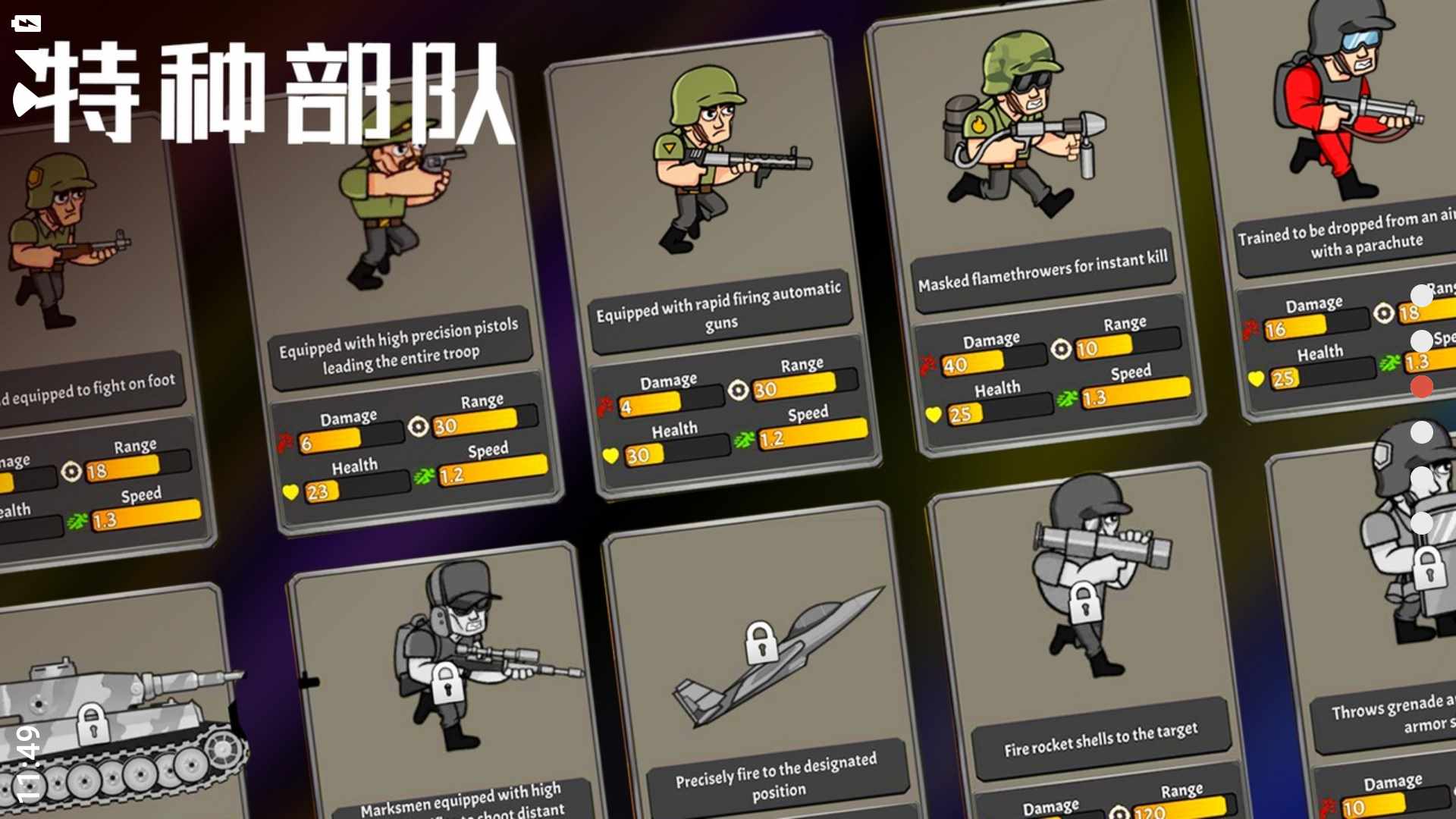 ●随着游戏进度,解锁各种军队、战争武器、装备和军用车辆,如坦克、战斗机、轰炸机和助推器。