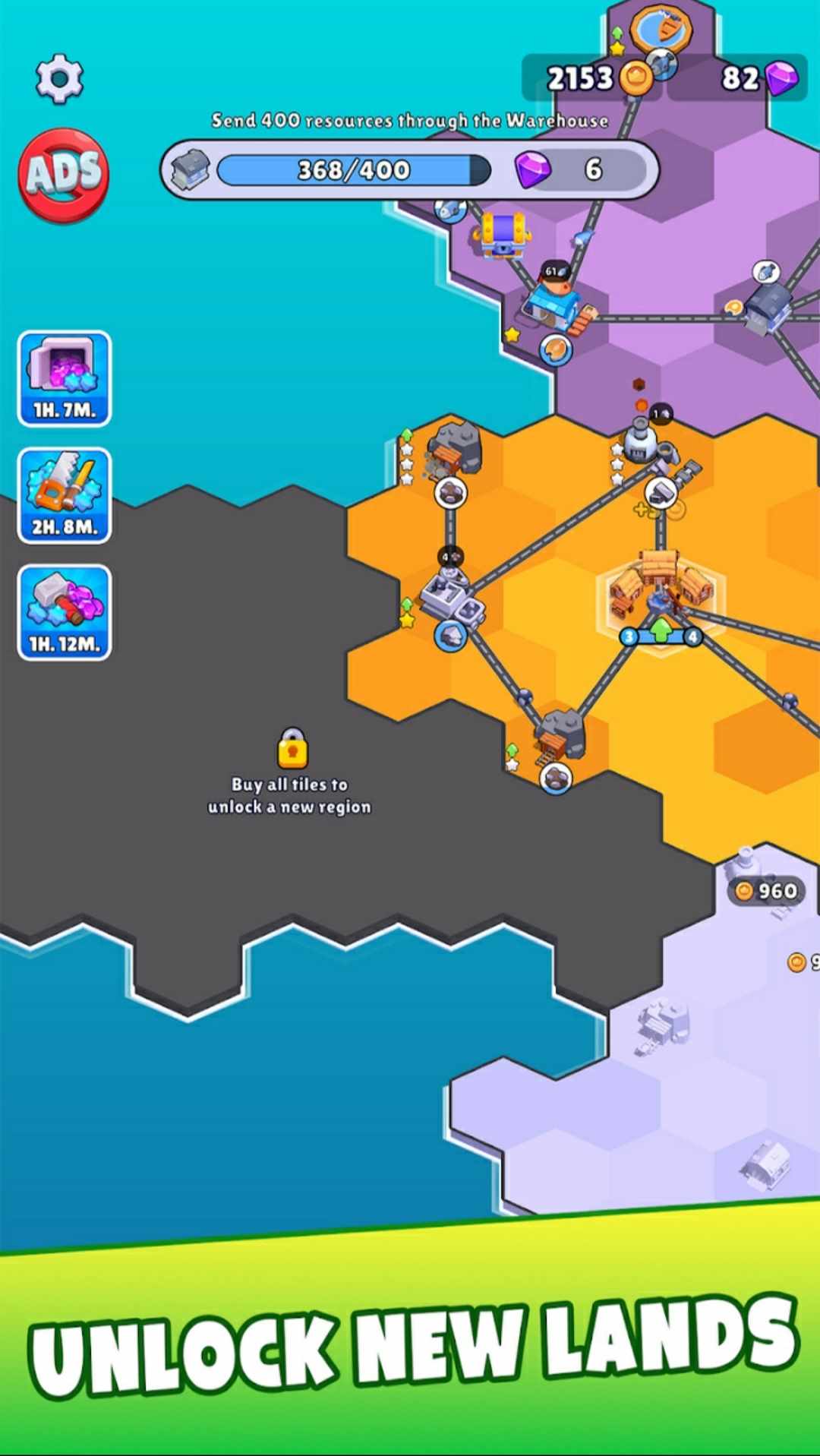 这款超级好玩的放置类世界建设模拟器游戏以供应链为核心,让你一次一格,逐步打造出整个人类文明。通过伐木、采矿、制作和加工原材料来赚取金币,然后再用它们来升级你的建筑设施,增加你的利润,好让你得以开辟更多的农场与城市,解锁一片又一片大陆,最终解锁这广阔世界中的每一个角落。