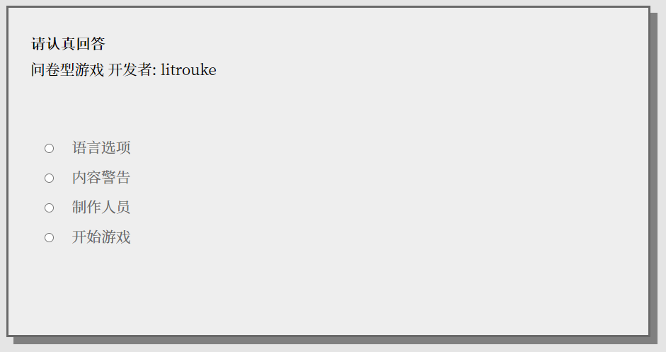 一款融合了文字冒险与恐怖元素的问卷答题游戏,其玩法独具匠心,让玩家在紧张刺激的氛围中享受解谜的乐趣。 游戏利用精炼而富有张力的文字描述,配合恰如其分的音效设计,构建起一种身临其境般的恐怖体验。 总之,《女鬼模拟器》是一款以文字作为媒介,通过答题方式步步推进情节,考验玩家智慧与胆识的恐怖游戏。
