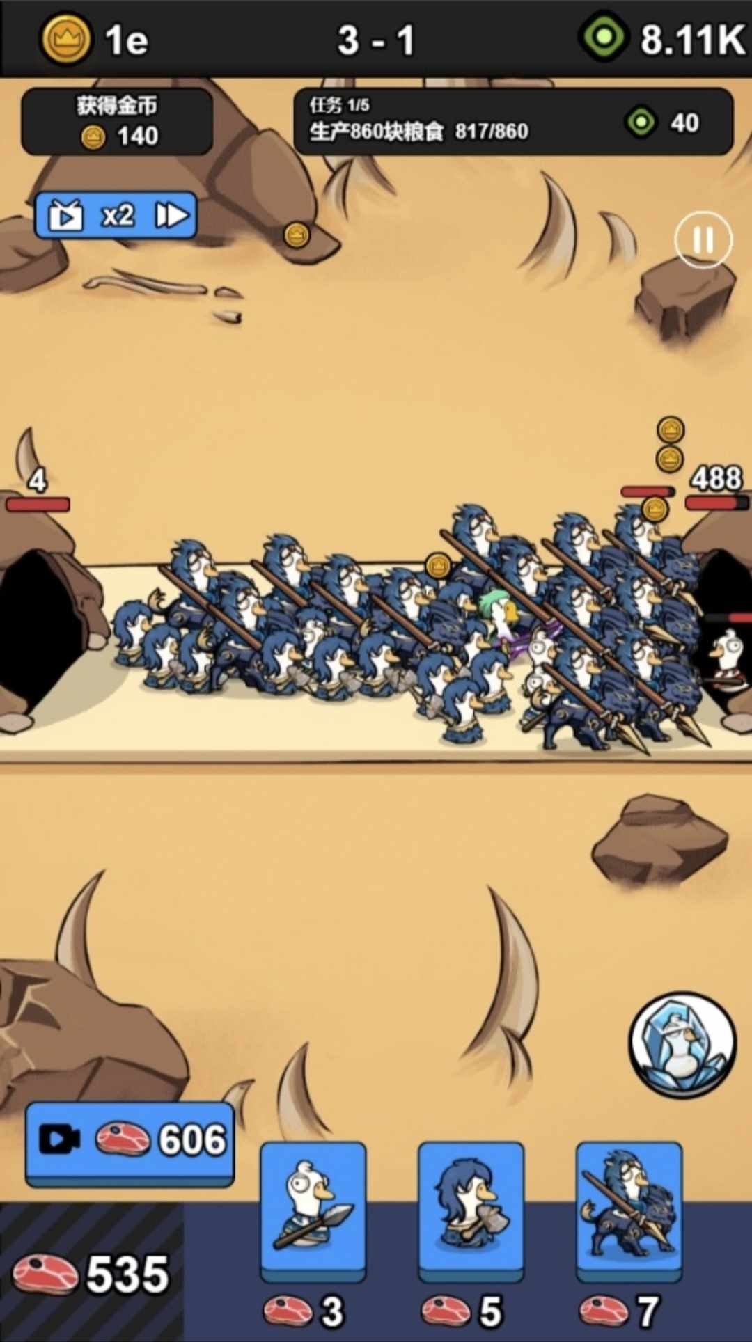 - 玩家需要在战斗中合理召唤部队,消耗资源召唤小兵,击败敌人以获得金币,金币可用于升级属性和开启新时代。不断召唤更多小兵,击败敌人,赢得胜利。
