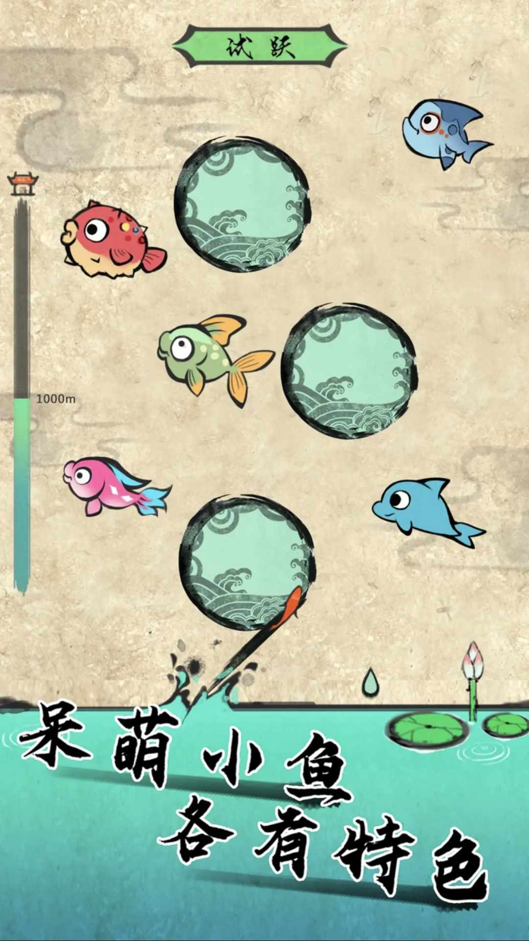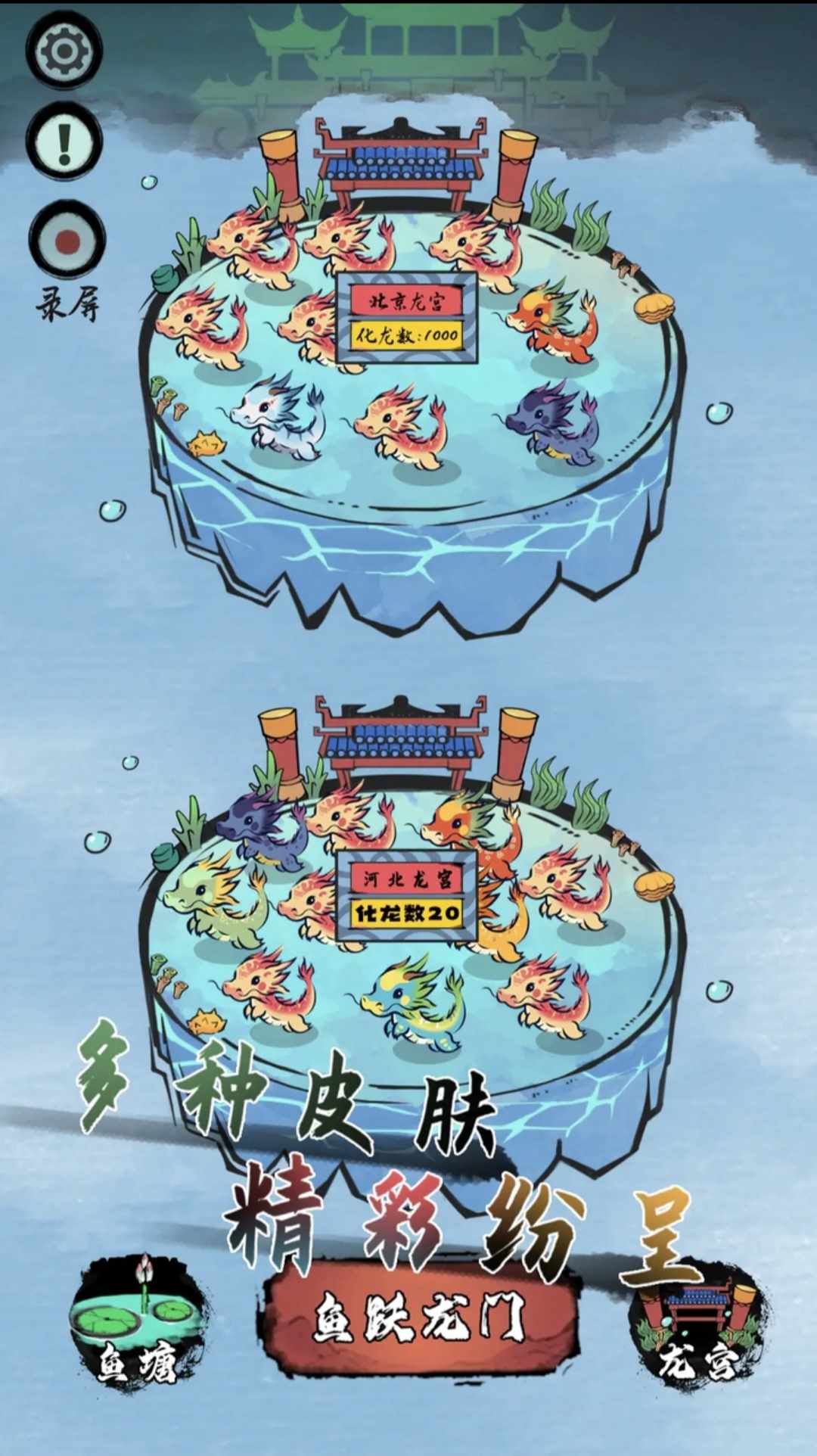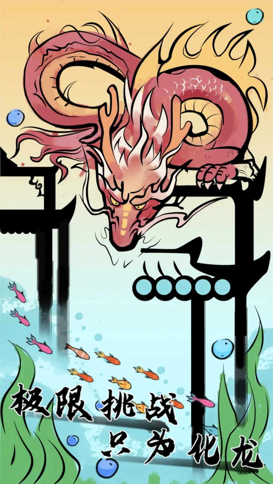 玩家通过收集不同种类的鱼,控制鱼一步一步跳过龙门变成真龙的玩法。游戏中鱼是通过一朵朵浪花实现一步一步跳跃到更高的地方。最后跃过龙门。每一朵浪花都会反时针方向转动,鱼接触某浪花,就会随着该浪花转动,玩家点击屏幕放手后,鱼会按着当前的角速度跃出,目标是跃到另一个更高位置的浪花上,从而形成步步高升目的。