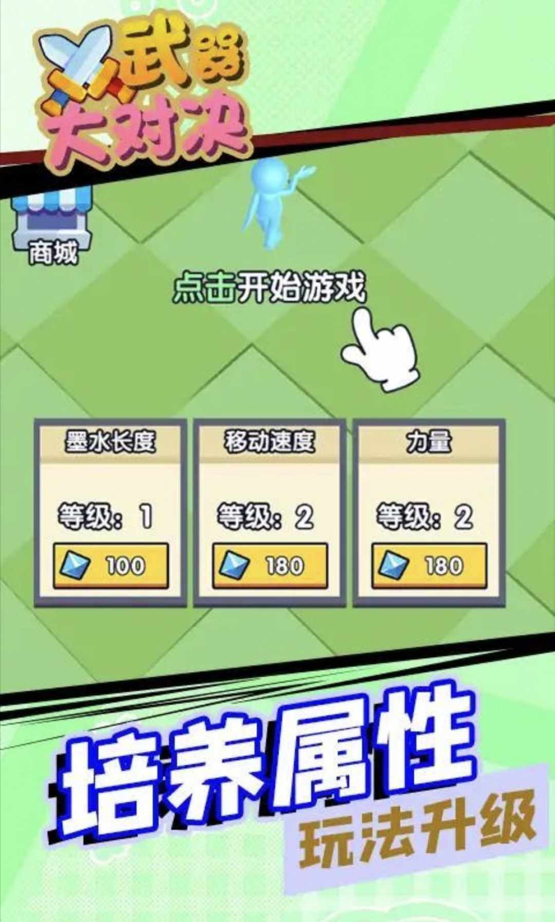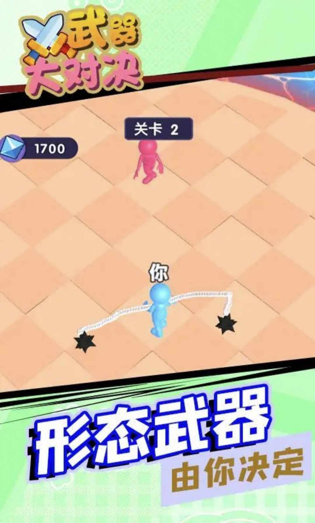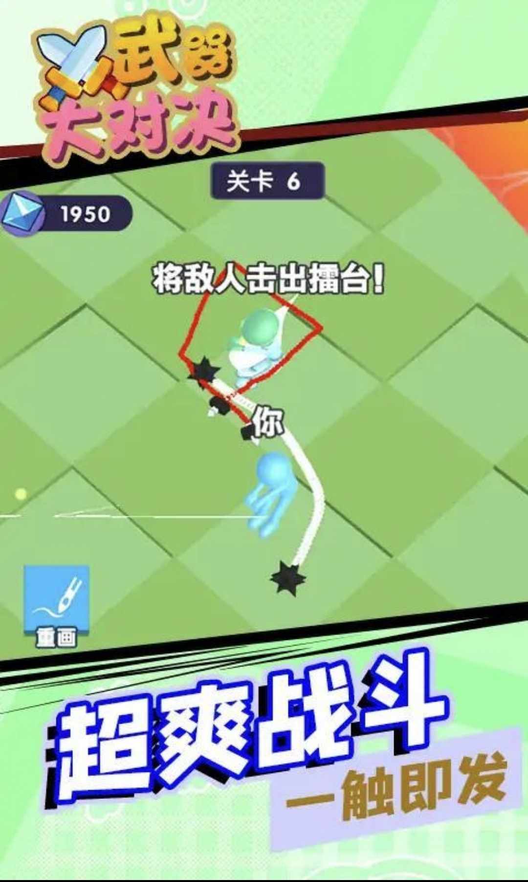 武器大决战是一款抖音上面的对战小游戏,轻松简单利用游戏中的笔墨来画出自己的游戏武器,轻松一笔进行绘画,利用不同的转动方式来将敌人击飞就能够获得关卡胜利,面对不同的敌人玩家可以画出不同的武器,轻松简单完成对战任务,多种游戏武器可以轻松绘画,简单进行游戏对战。