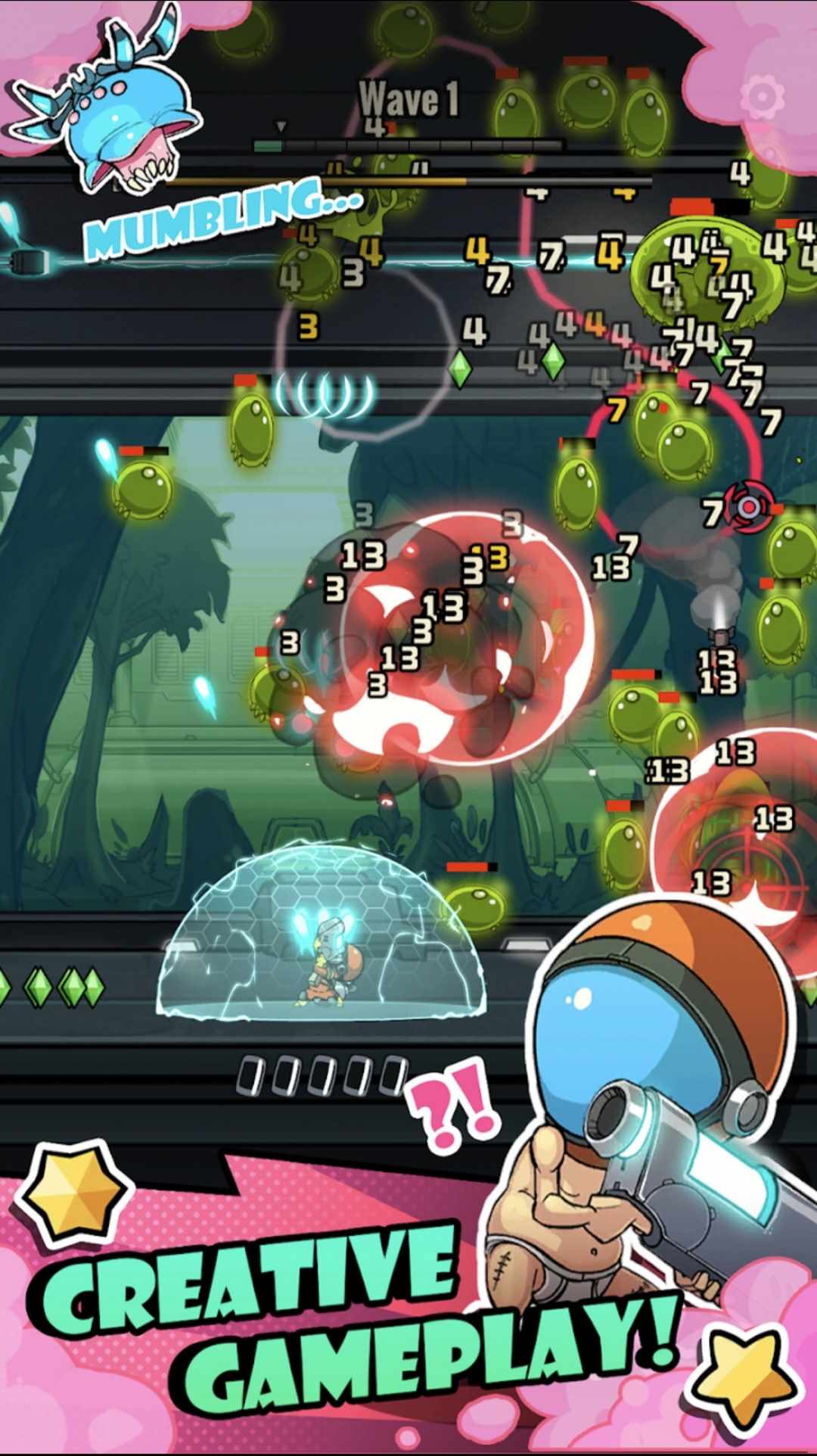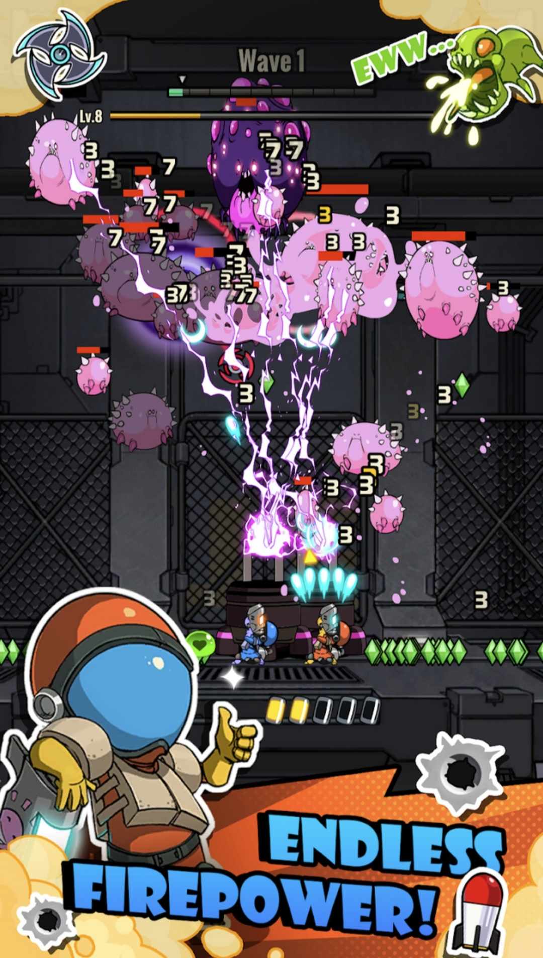 Roguelike 元素让每一场战斗都充满新鲜感。在每一波之后,从三个随机技能中进行选择,以增强您的太空战士的能力。创造强大的协同效应来应对更强大的敌人。