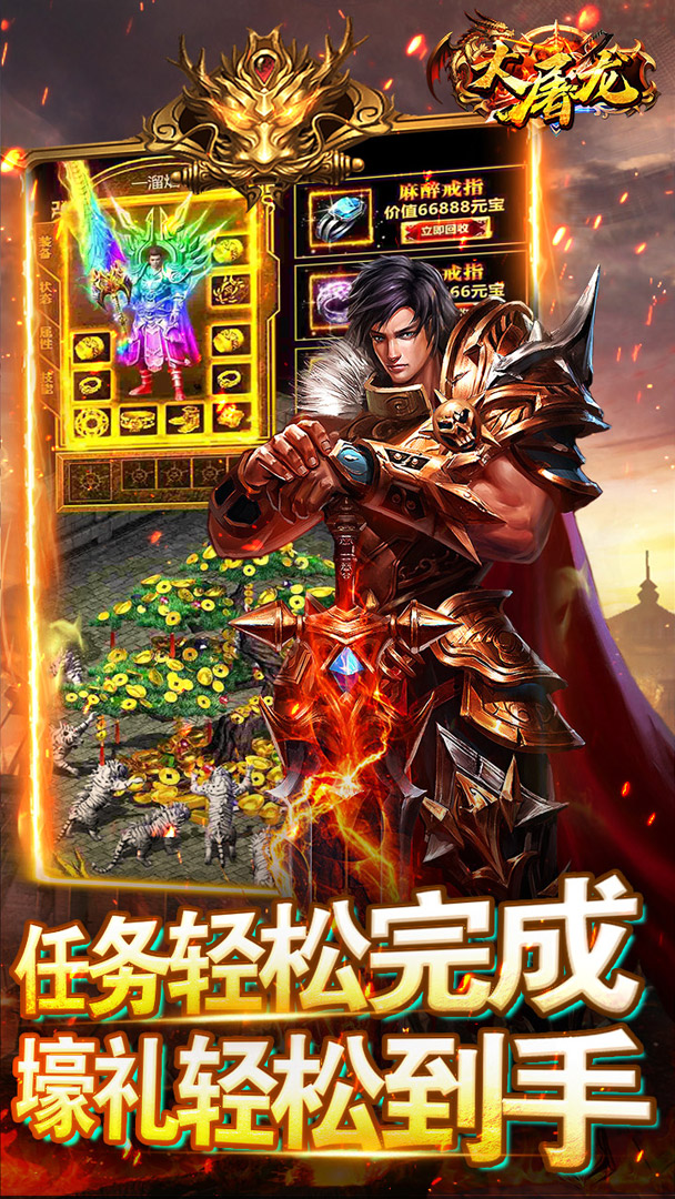 《大屠龙(金龙献瑞)》——踏入刀光剑影与福利盛宴并存的传奇天地!登录即领周卡+月卡+年卡,充值点红包、首充豪华大礼待君采撷。任务多多、在线奖励、首杀爆物、升级惊喜,大量福利助力提升。野外地图暗藏玄机,击杀地图福利怪,解锁意外收获。热血攻沙,问鼎沙城之巅,统御全服,成就不朽传奇,更有海量灵符重赏各位豪杰英雄!诚邀你共赴这场惊心动魄的冒险盛宴,开启属于你的英雄时代!