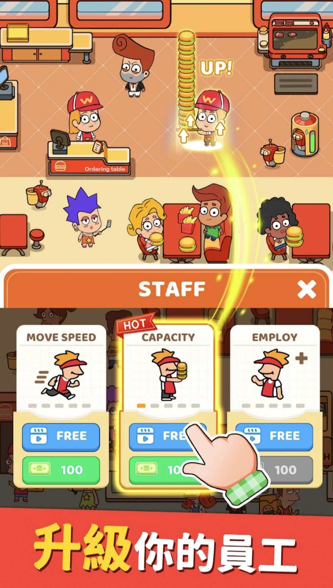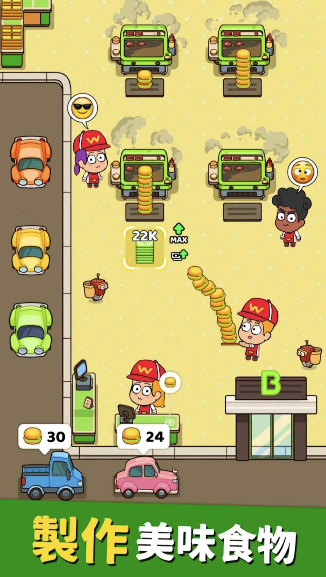建立你的团队,提升技能!招募和培训厨师、服务员和其他员工,他们将成为你成功的关键。透过提升他们的技能和能力,提供更有效率的服务,让你的汉堡店运作更加顺利。