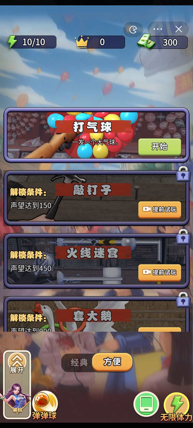 《搞钱高手》是一款模拟现实摊位游戏,通过小游戏,可体验到一比一还原现实中的套圈、射气球、滚轮胎等经典的摊位游戏,让我们给年轻的老板上一课!把老板的宝贝全给盘到手!!!