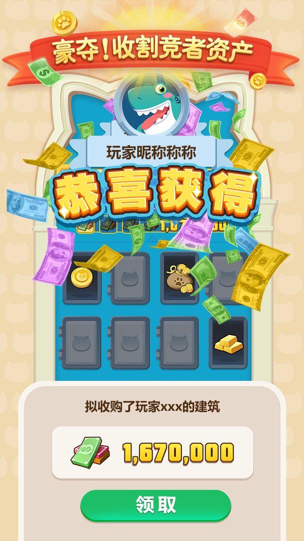 ·消耗喵币置换地产,建设自己的城市,每次建设的结果都会被纳入商业版图中,并积累更多财富收益;