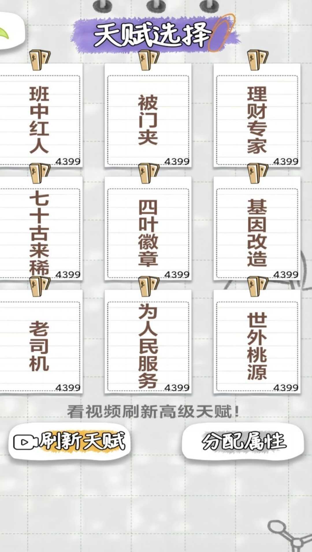 选择随机属性,开启不同人生,迎来不同结局,解锁不同成就!