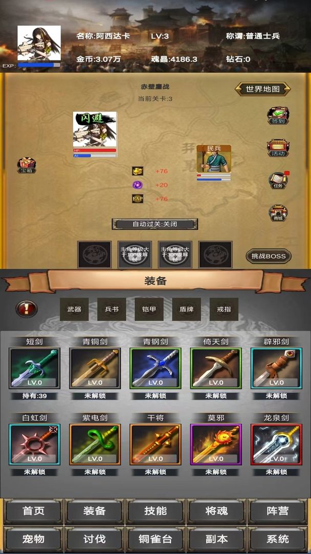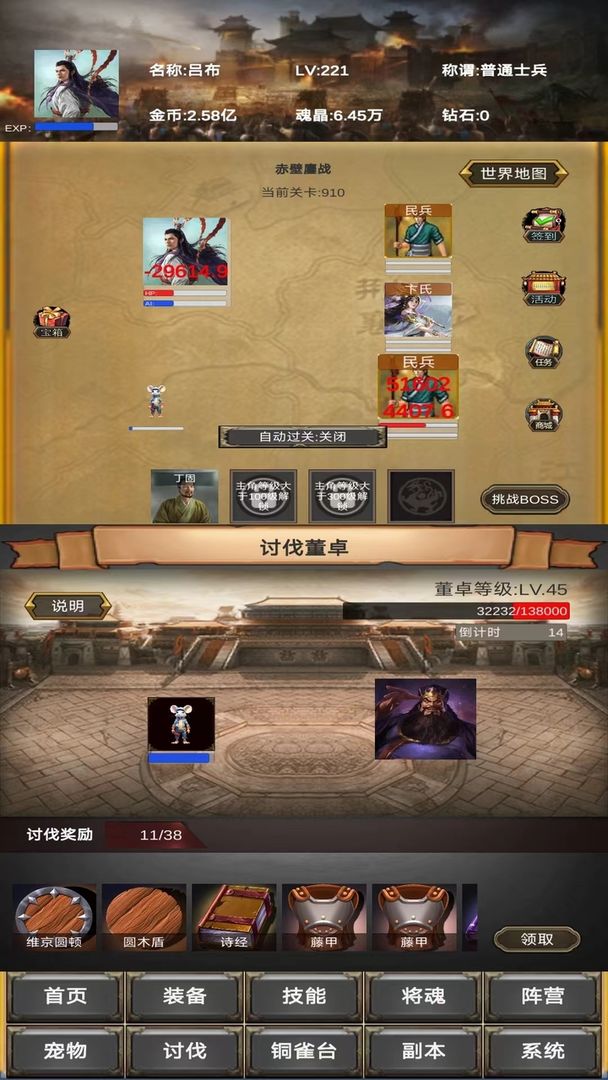 一款简单好玩的点击放置三国游戏,在战斗中可以获得意想不到的奖励,可以不断升级属性,获得武将,技能,宠物,羁绊等,并可以不断的提升等级和星级,解锁各种新颖玩法,等你来体验