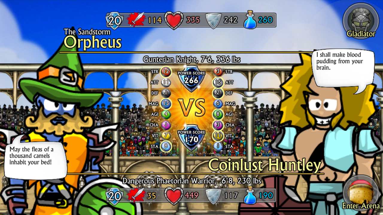 刀剑竞技场2,你准备好在竞技场中一较高下了吗? 世界上最受欢迎的角斗士游戏又回来了,规模比以往更大,内容更丰富。刀剑竞技场2:皇帝的统治回来了,重新制作了全新的图形、音乐和强大的新技能以及竞技场冠军。 进入刀剑竞技场2,与王国中最优秀的角斗士对战。游戏特色: * 快速回合制战术战斗,有 30 多种不同的战斗技能可供学习。 * 巫师还是战士?创建并升级您的角斗士,在此过程中学习毁灭性的攻击。 * 在您走向伟大的旅程中使用 200 多种不同的武器和盔甲。 * 20 位竞技场冠军,既有经典的,也有新的,包括强大的法老王、 经典的屠夫约翰和令人兴奋的职业摔跤手 Ultra Flavius! * 6 个竞技场可供战斗,从地下的战斗坑到皇帝宫殿的高处。